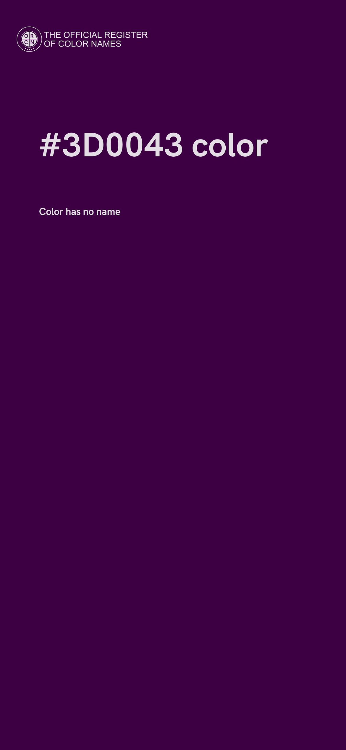 The digital color HEX #3D0043 belongs to the Magenta Color Family featuring Full Saturation (Saturation Family) and Dark (Brightness Family).