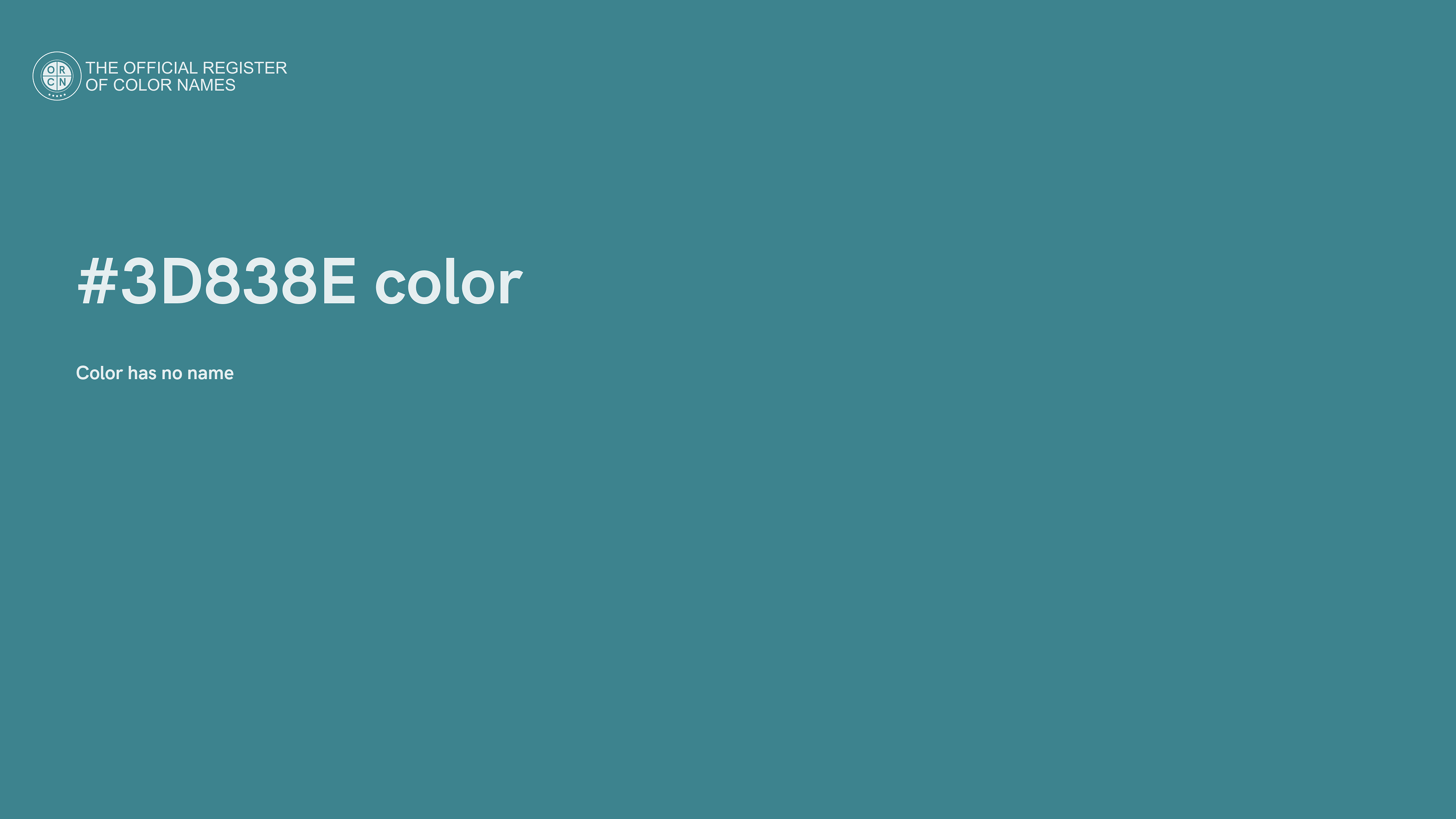For printing in non digital world, #3D838E is represented in CMYK as 32 Cyan, 4 Magenta, 0 Yellow, and 44 Black (Key) (C:32 M:4 Y:0 K:44).