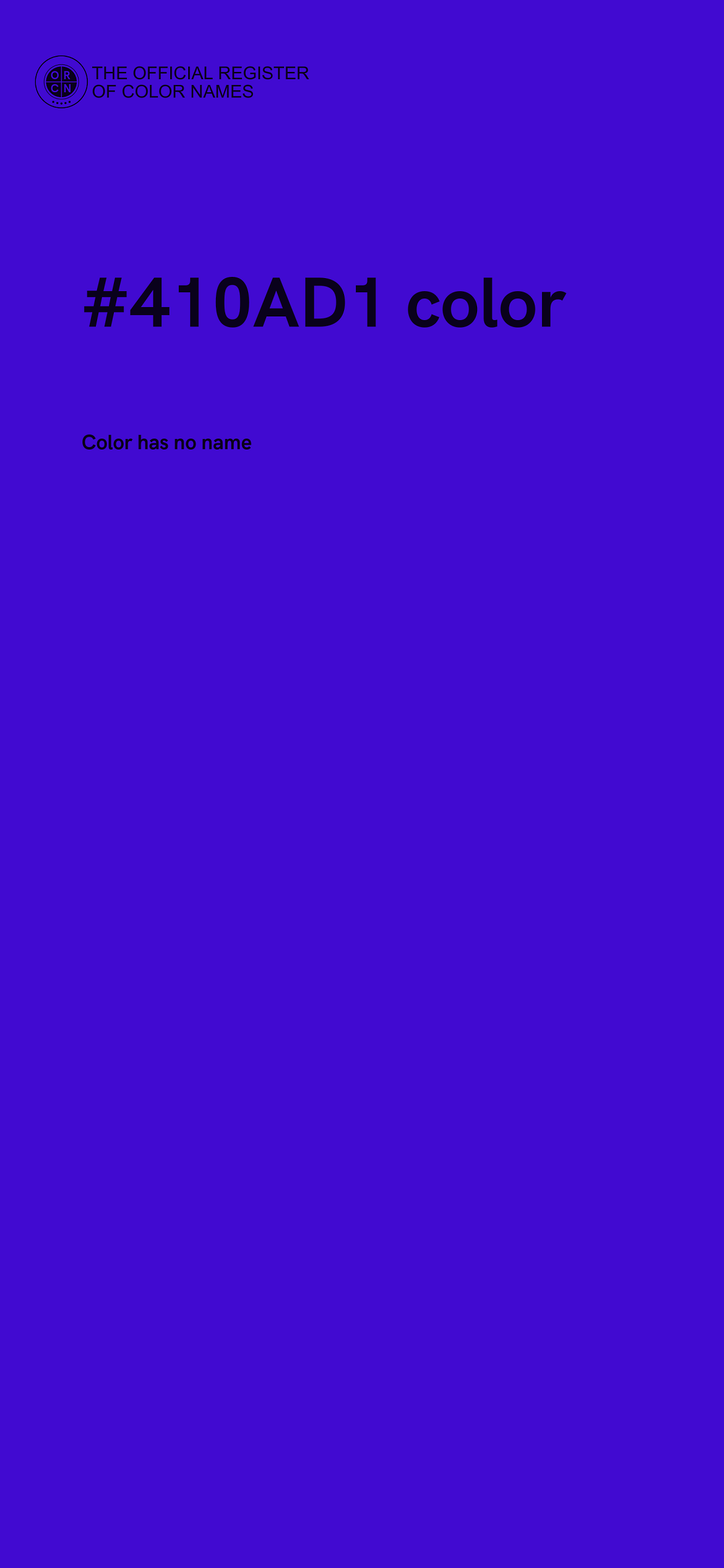 For printing in non digital world, #410AD1 is represented in CMYK as 56 Cyan, 78 Magenta, 0 Yellow, and 18 Black (Key) (C:56 M:78 Y:0 K:18).