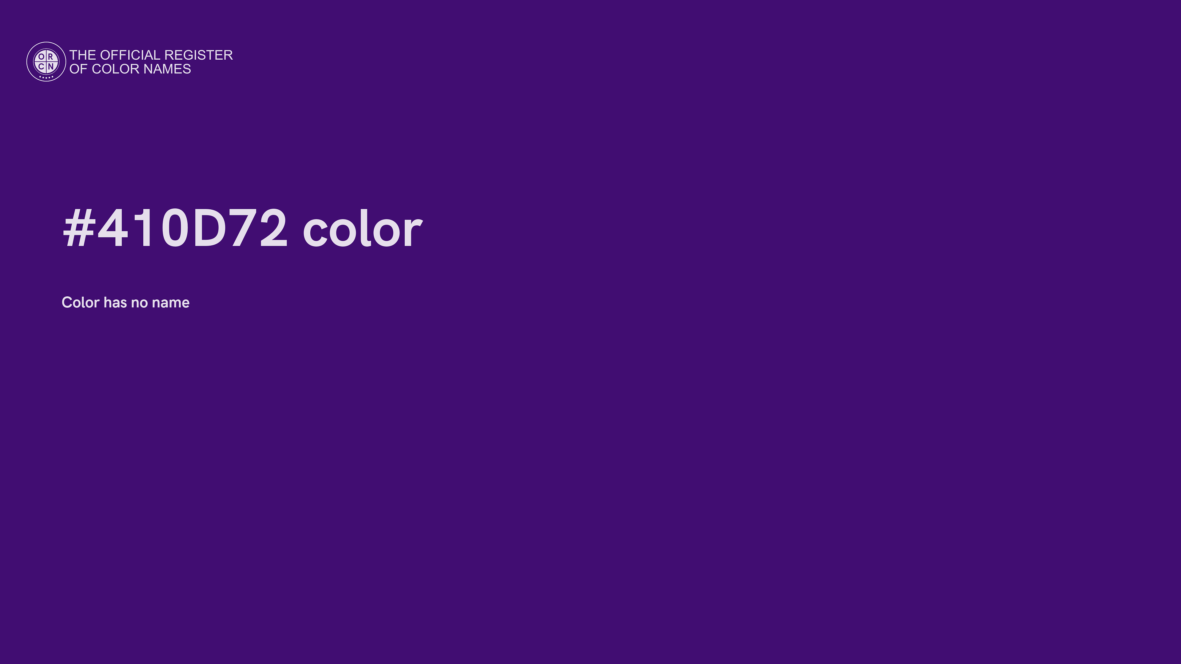 For printing in non digital world, #410D72 is represented in CMYK as 19 Cyan, 40 Magenta, 0 Yellow, and 55 Black (Key) (C:19 M:40 Y:0 K:55).