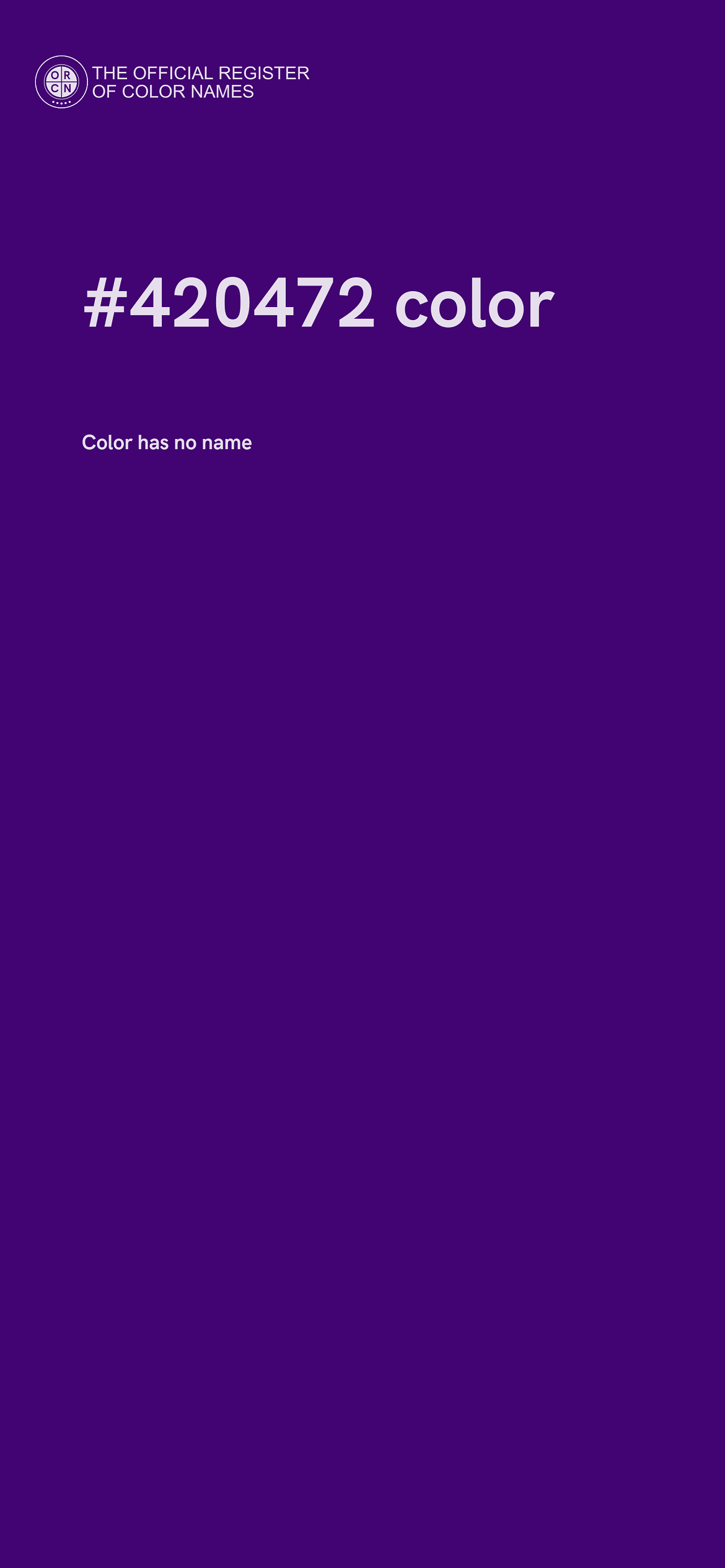 The digital color HEX #420472 belongs to the Violet Color Family featuring Full Saturation (Saturation Family) and Dark (Brightness Family).