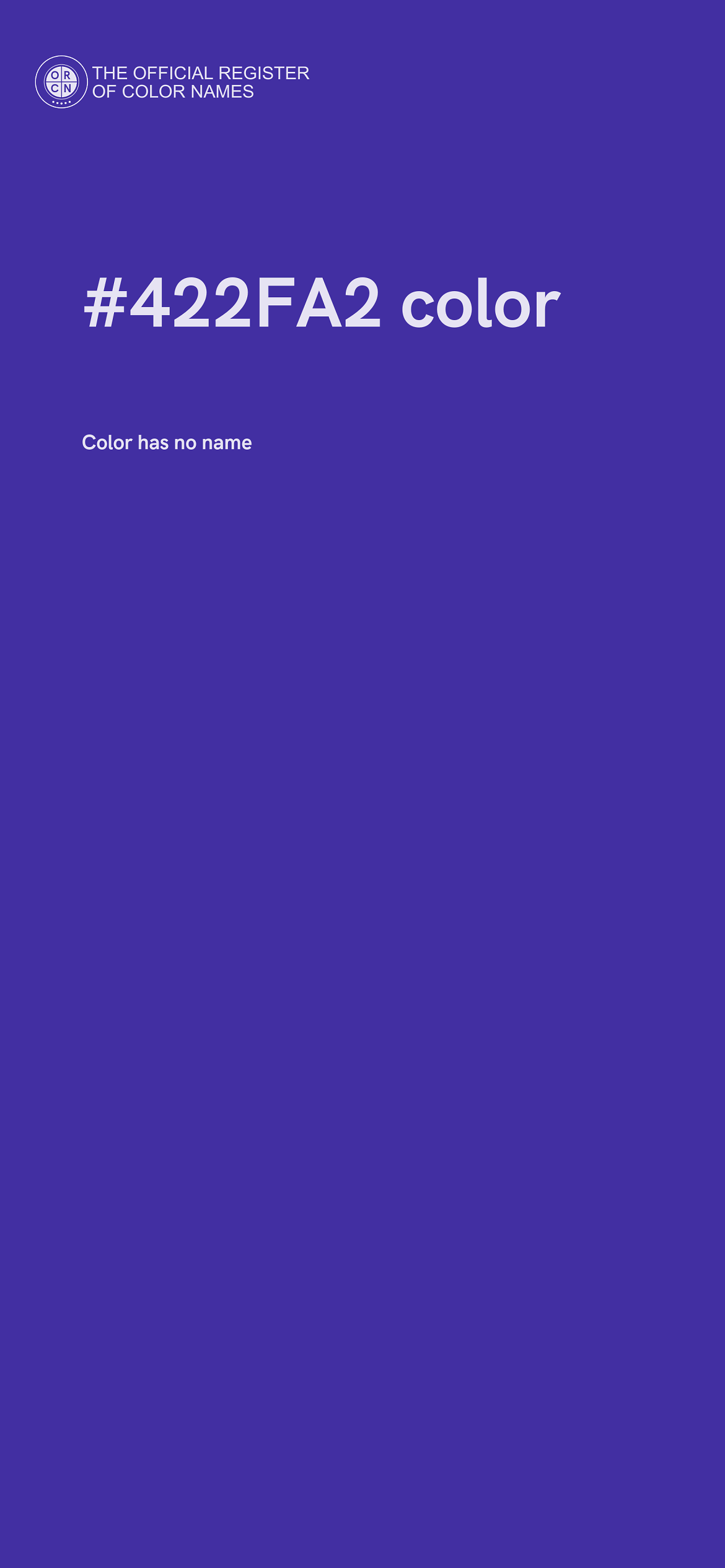 For printing in non digital world, #422FA2 is represented in CMYK as 38 Cyan, 45 Magenta, 0 Yellow, and 36 Black (Key) (C:38 M:45 Y:0 K:36).