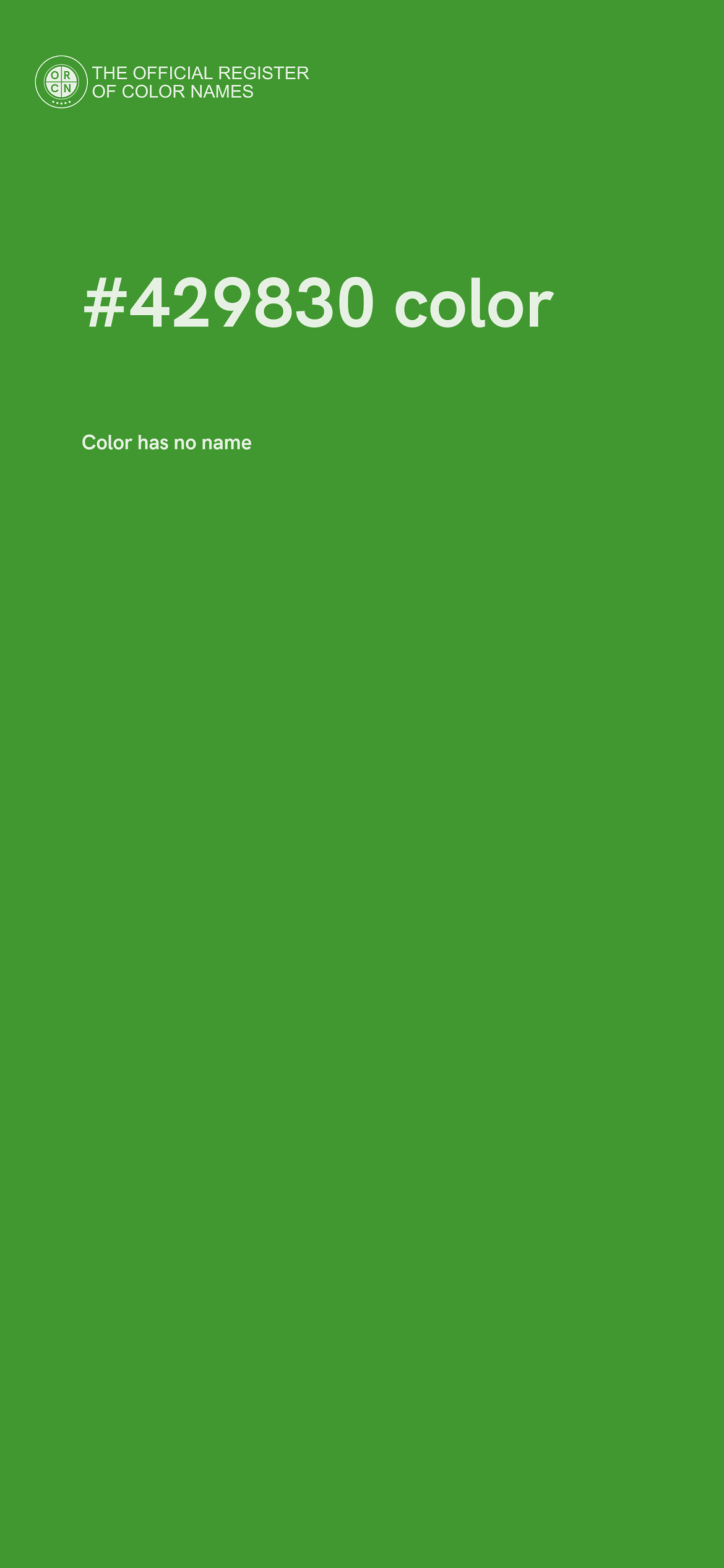 The digital color HEX #429830 belongs to the Green Color Family featuring Moderate Saturation (Saturation Family) and Neutral (Brightness Family).