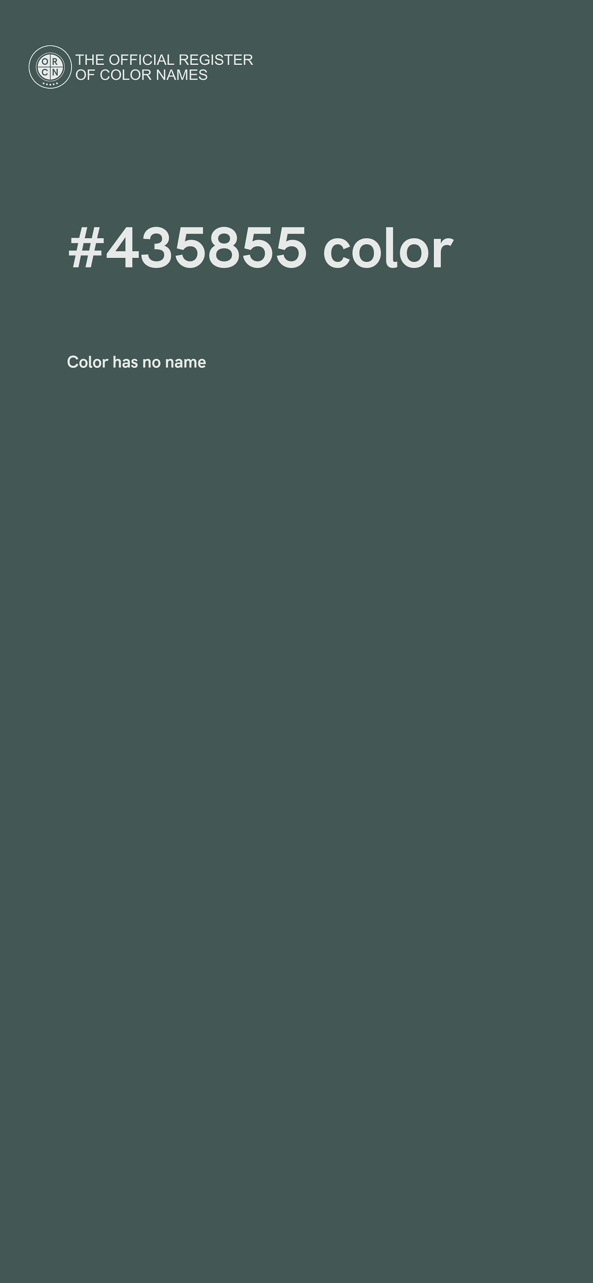 The digital color HEX #435855 belongs to the Cyan Color Family featuring Low Saturation (Saturation Family) and Neutral (Brightness Family).