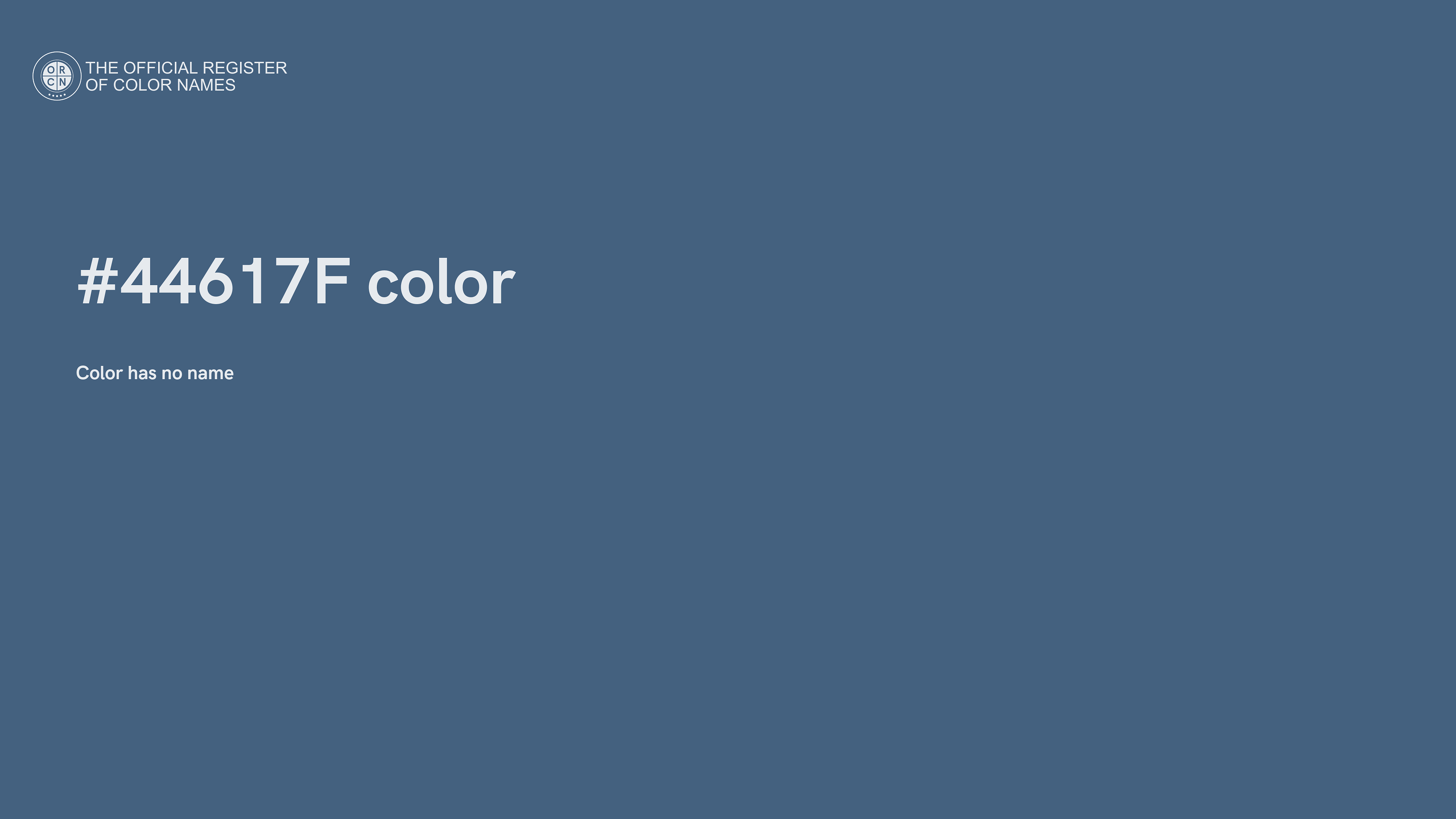 The digital color HEX #44617F belongs to the Azure Color Family featuring Mild Saturation (Saturation Family) and Neutral (Brightness Family).