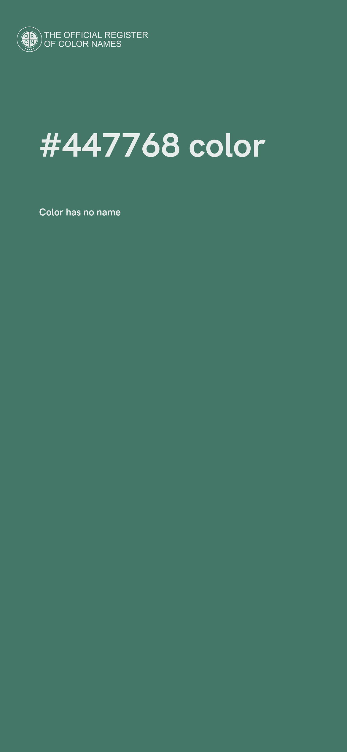 The digital color HEX #447768 belongs to the Spring Green Color Family featuring Mild Saturation (Saturation Family) and Neutral (Brightness Family).