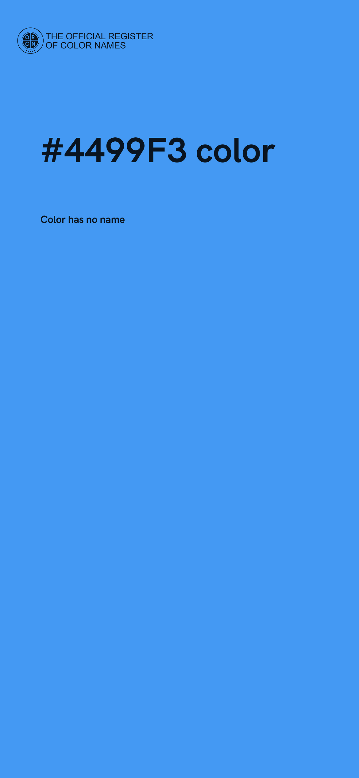 The digital color HEX #4499F3 belongs to the Azure Color Family featuring Full Saturation (Saturation Family) and Very Light (Brightness Family).