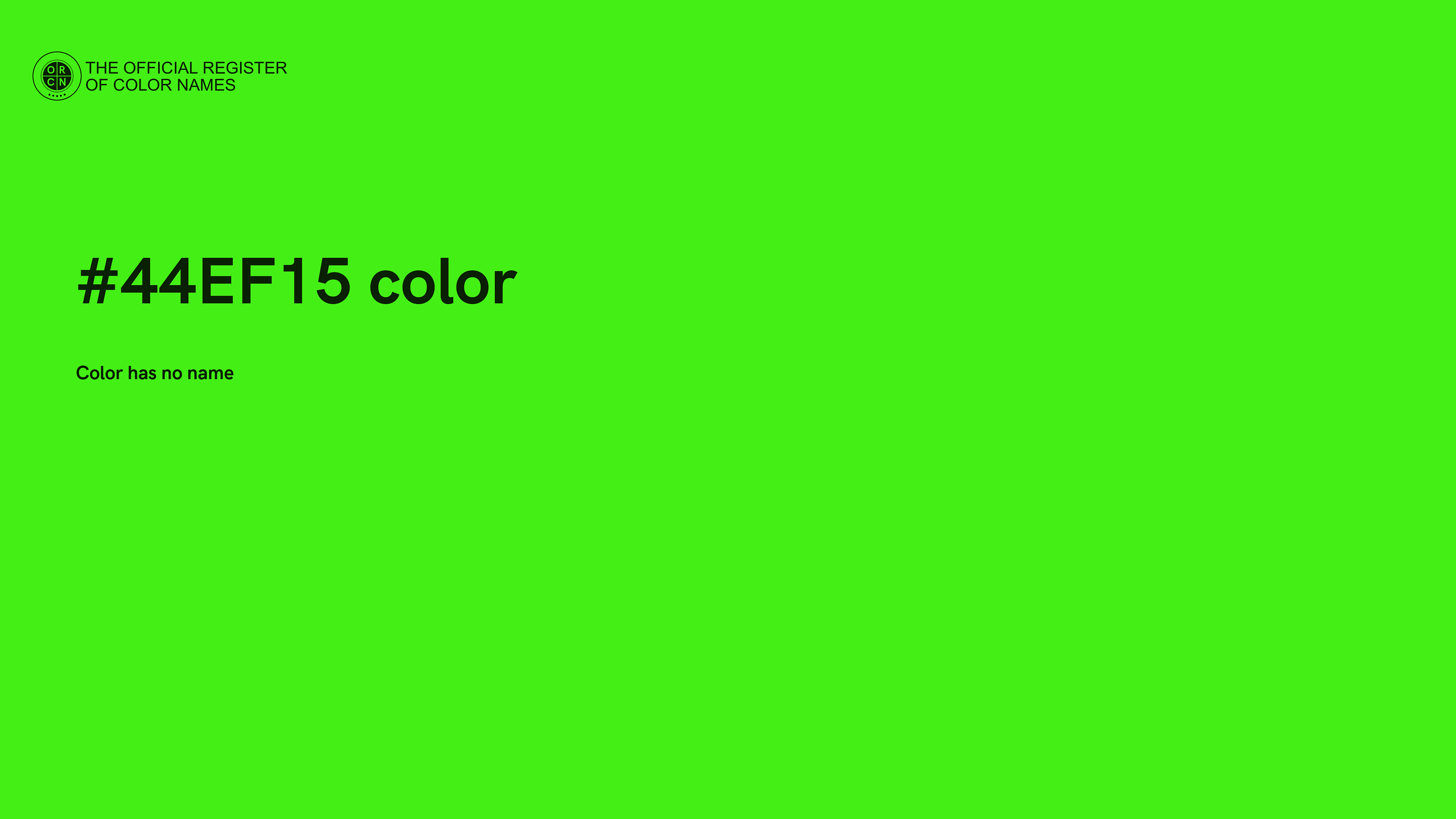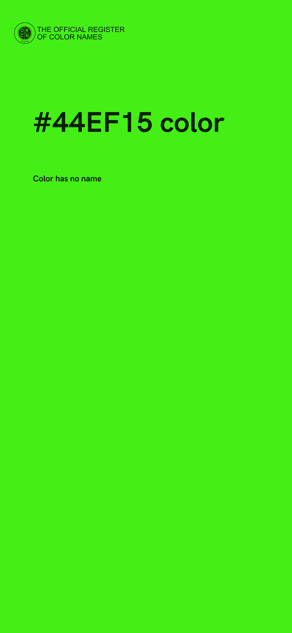 The digital color HEX #44EF15 belongs to the Green Color Family featuring Full Saturation (Saturation Family) and Light (Brightness Family).