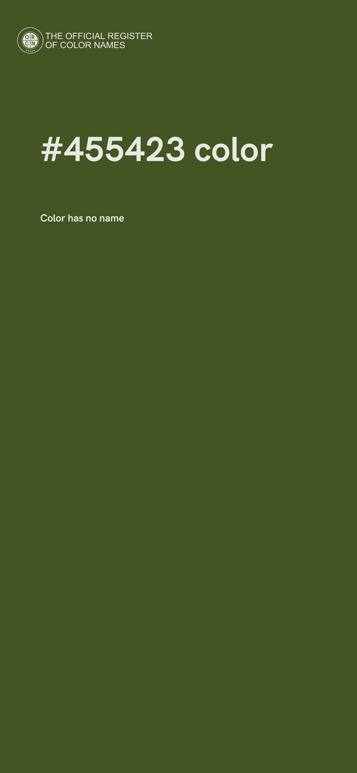 For printing in non digital world, #455423 is represented in CMYK as 6 Cyan, 0 Magenta, 19 Yellow, and 67 Black (Key) (C:6 M:0 Y:19 K:67).