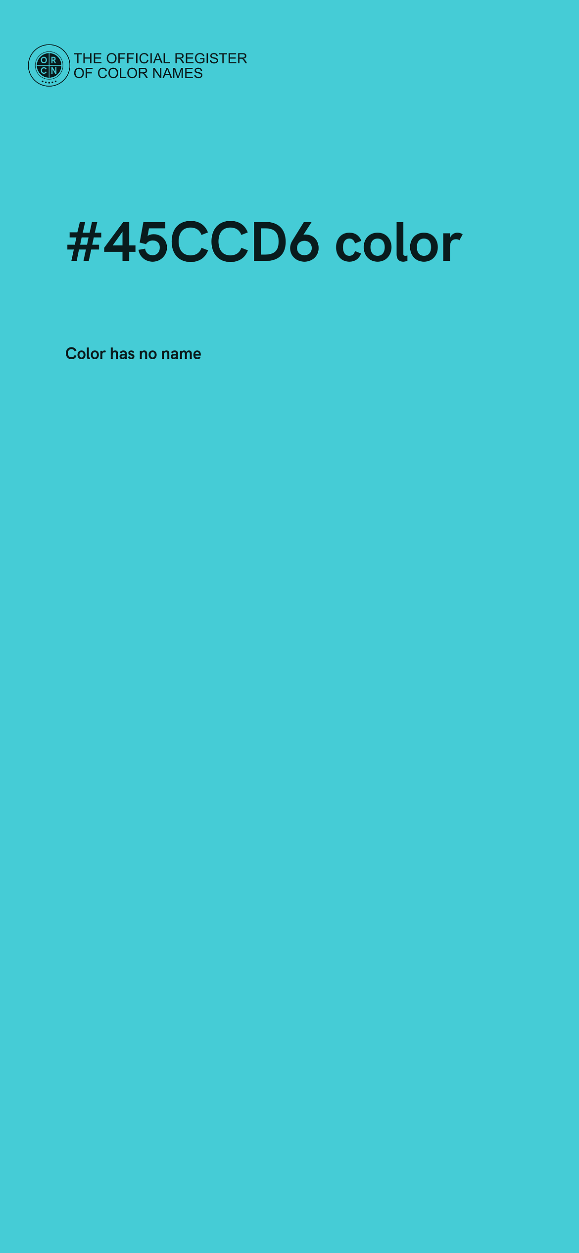 The digital color HEX #45CCD6 belongs to the Cyan Color Family featuring High Saturation (Saturation Family) and Light (Brightness Family).