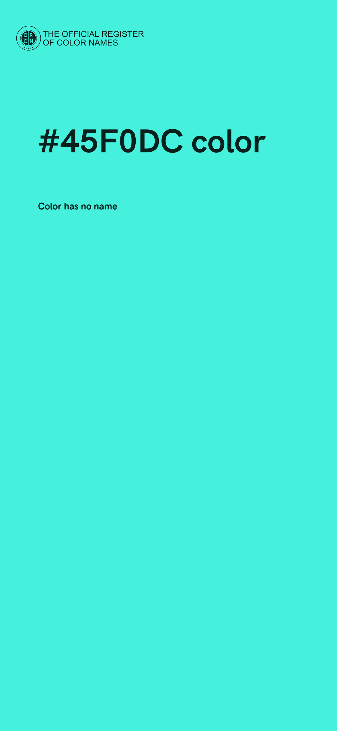 The digital color HEX #45F0DC belongs to the Cyan Color Family featuring Full Saturation (Saturation Family) and Very Light (Brightness Family).