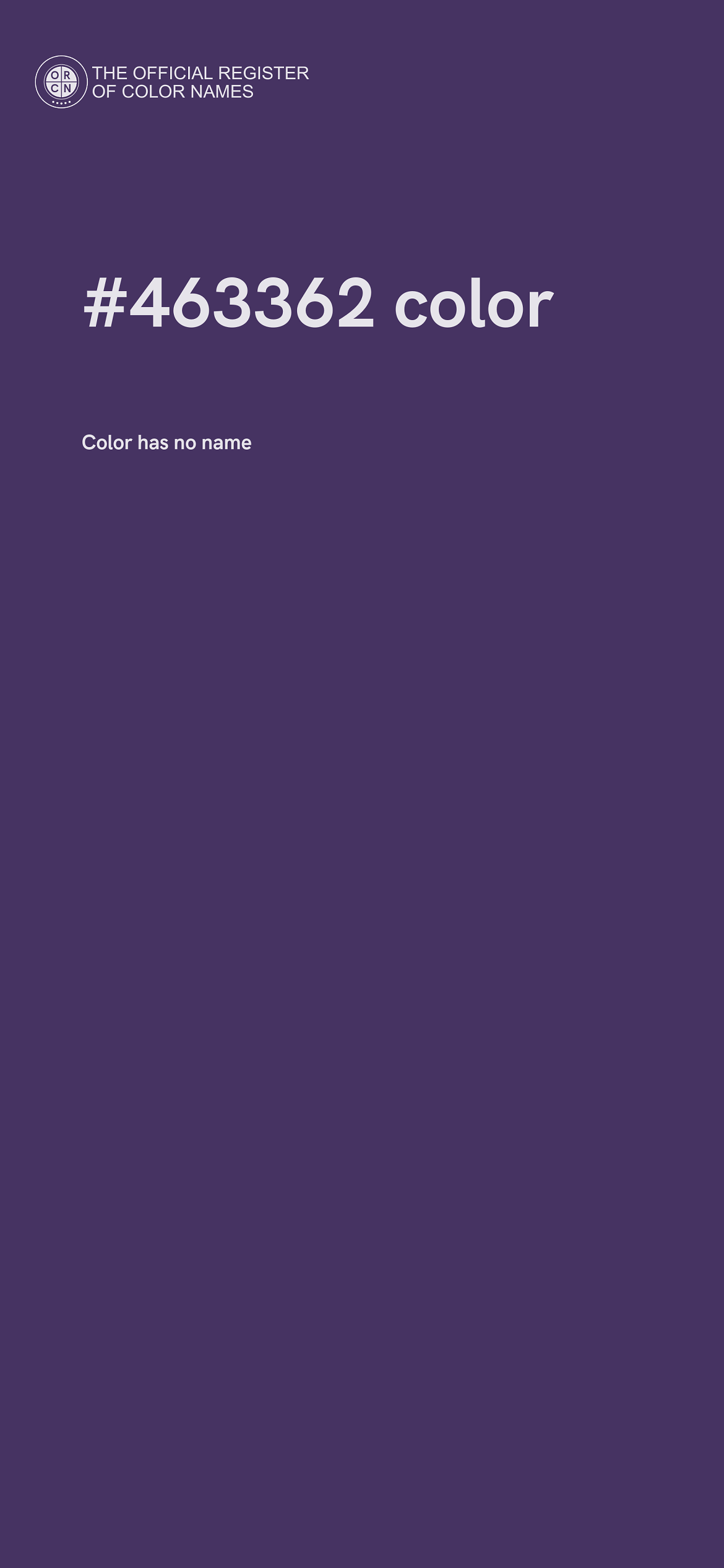 The digital color HEX #463362 belongs to the Violet Color Family featuring Mild Saturation (Saturation Family) and Neutral (Brightness Family).