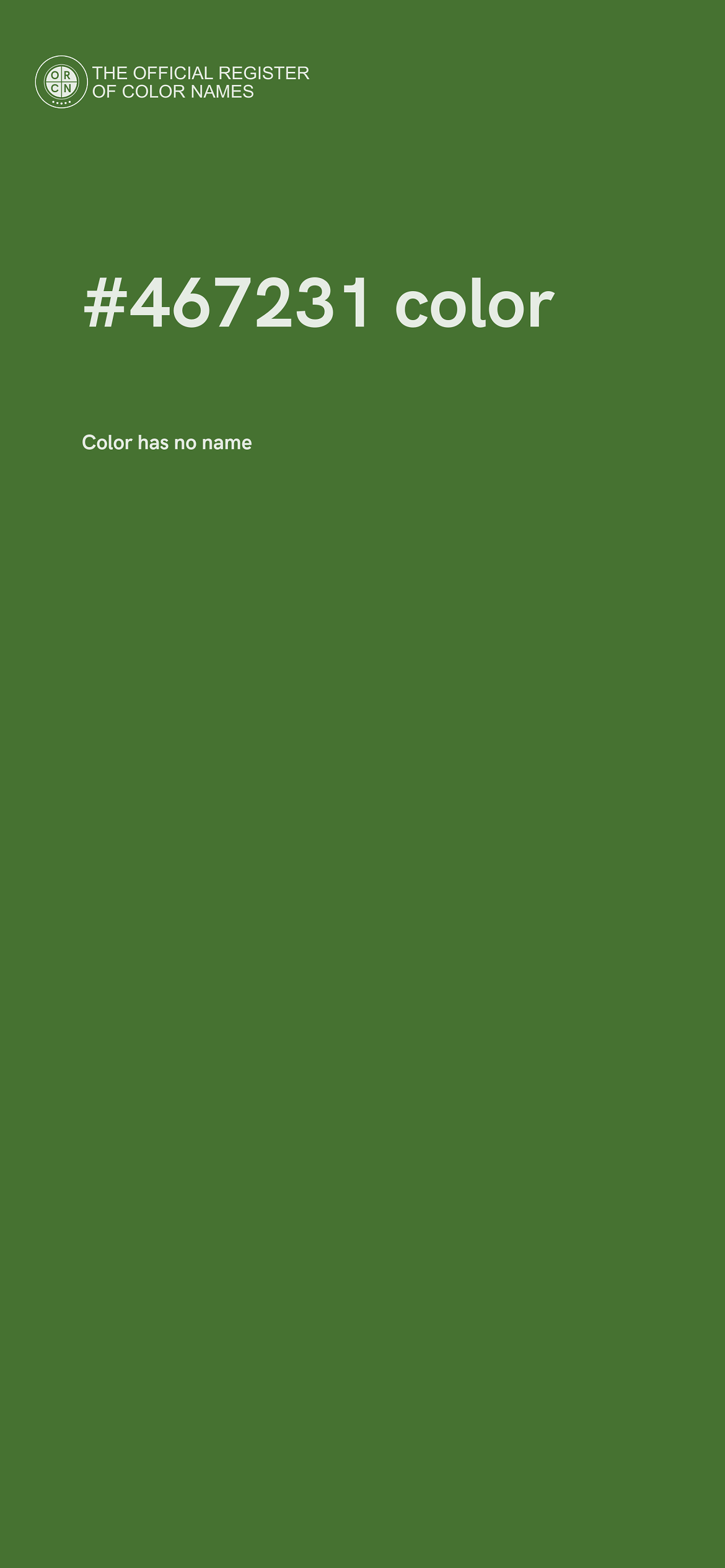 For printing in non digital world, #467231 is represented in CMYK as 17 Cyan, 0 Magenta, 25 Yellow, and 55 Black (Key) (C:17 M:0 Y:25 K:55).