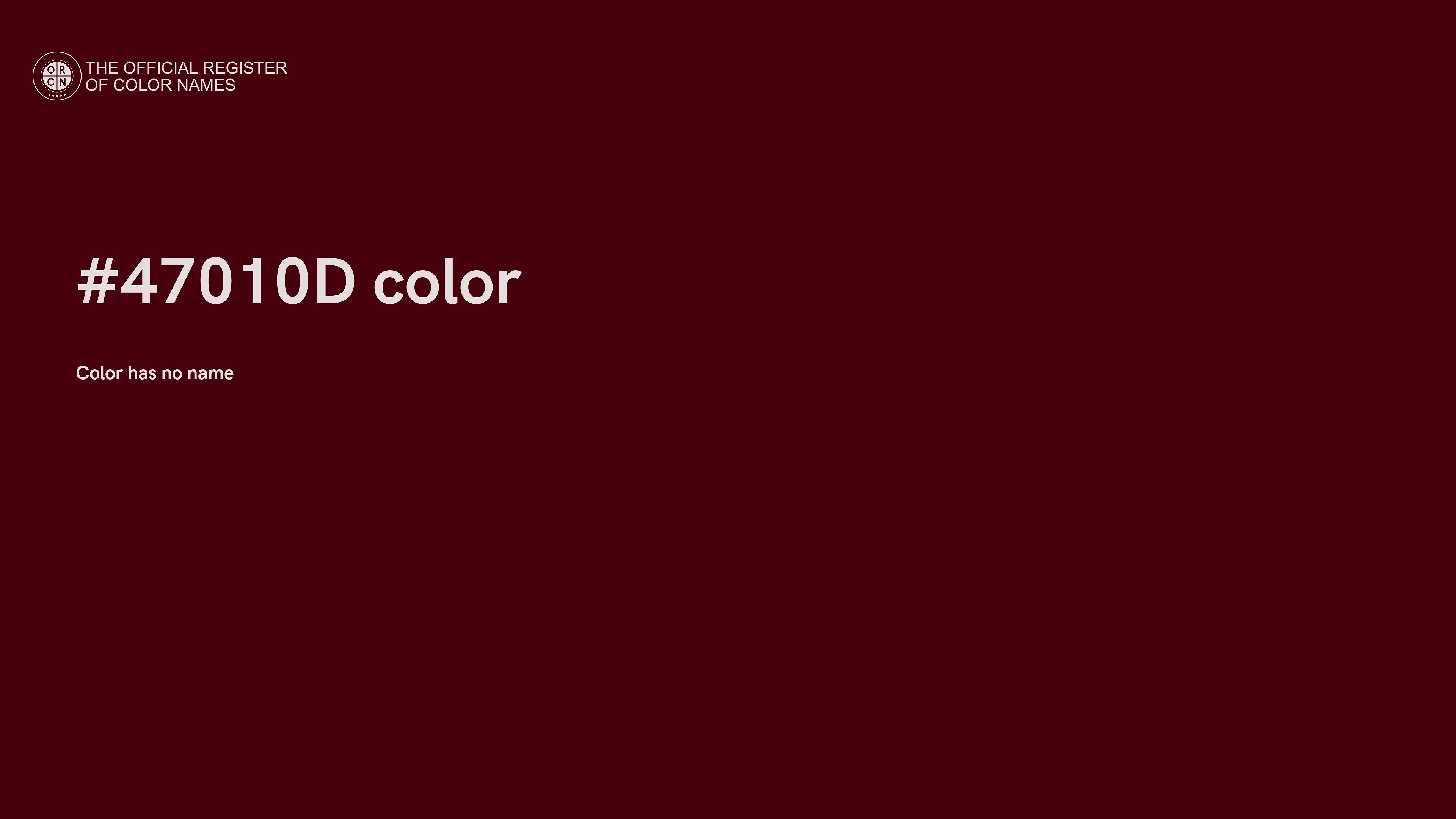 The digital color HEX #47010D belongs to the Red Color Family featuring Full Saturation (Saturation Family) and Dark (Brightness Family).
