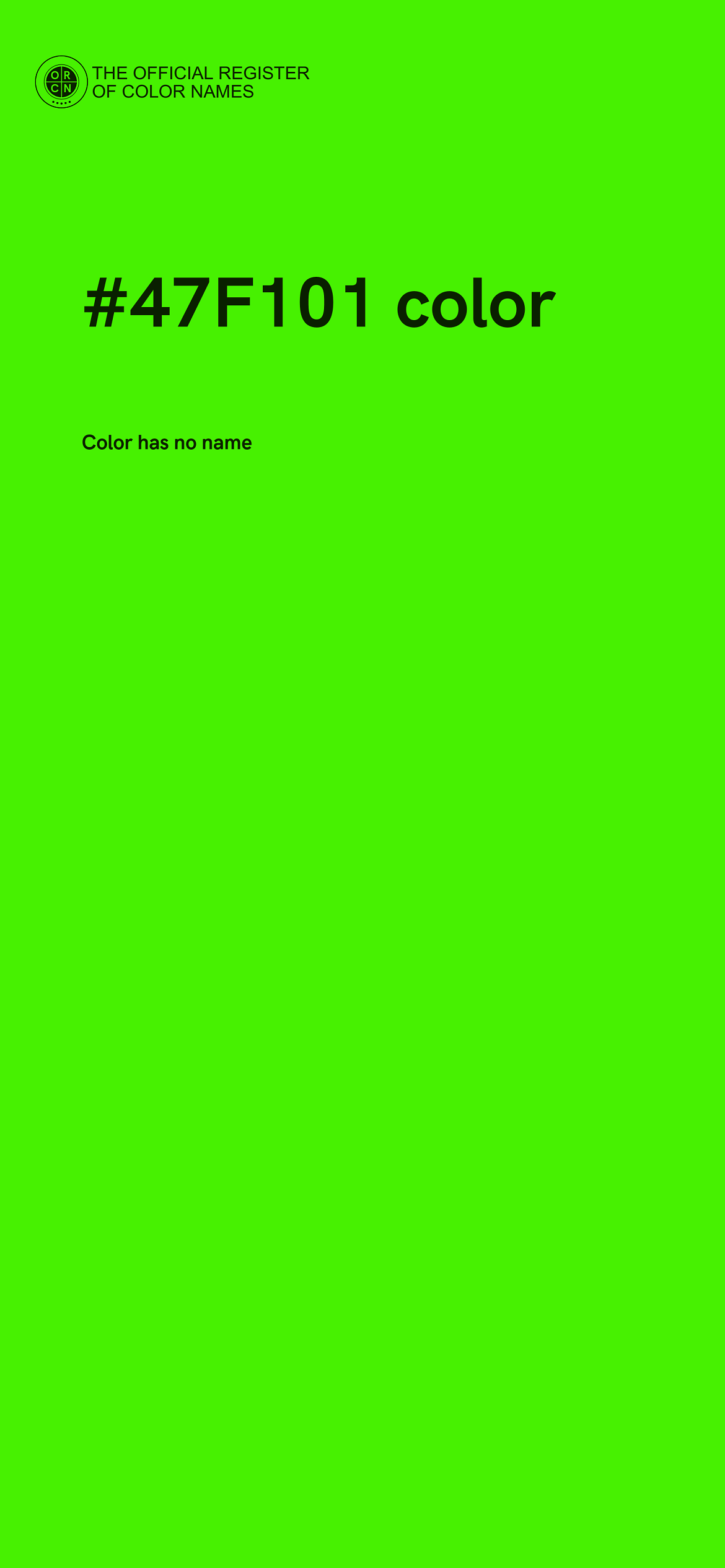 The digital color HEX #47F101 belongs to the Chartreuse Color Family featuring Full Saturation (Saturation Family) and Light (Brightness Family).