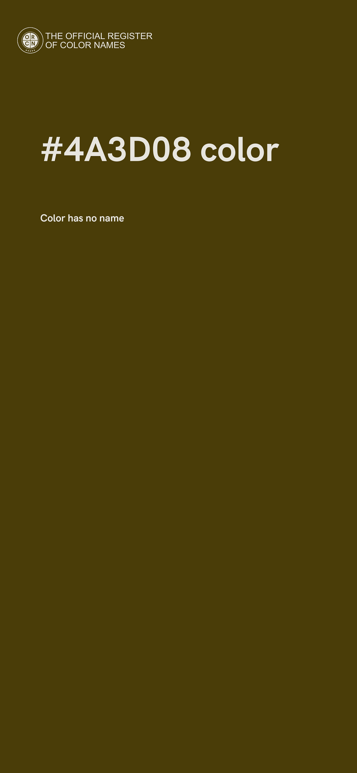 For printing in non digital world, #4A3D08 is represented in CMYK as 0 Cyan, 5 Magenta, 26 Yellow, and 71 Black (Key) (C:0 M:5 Y:26 K:71).