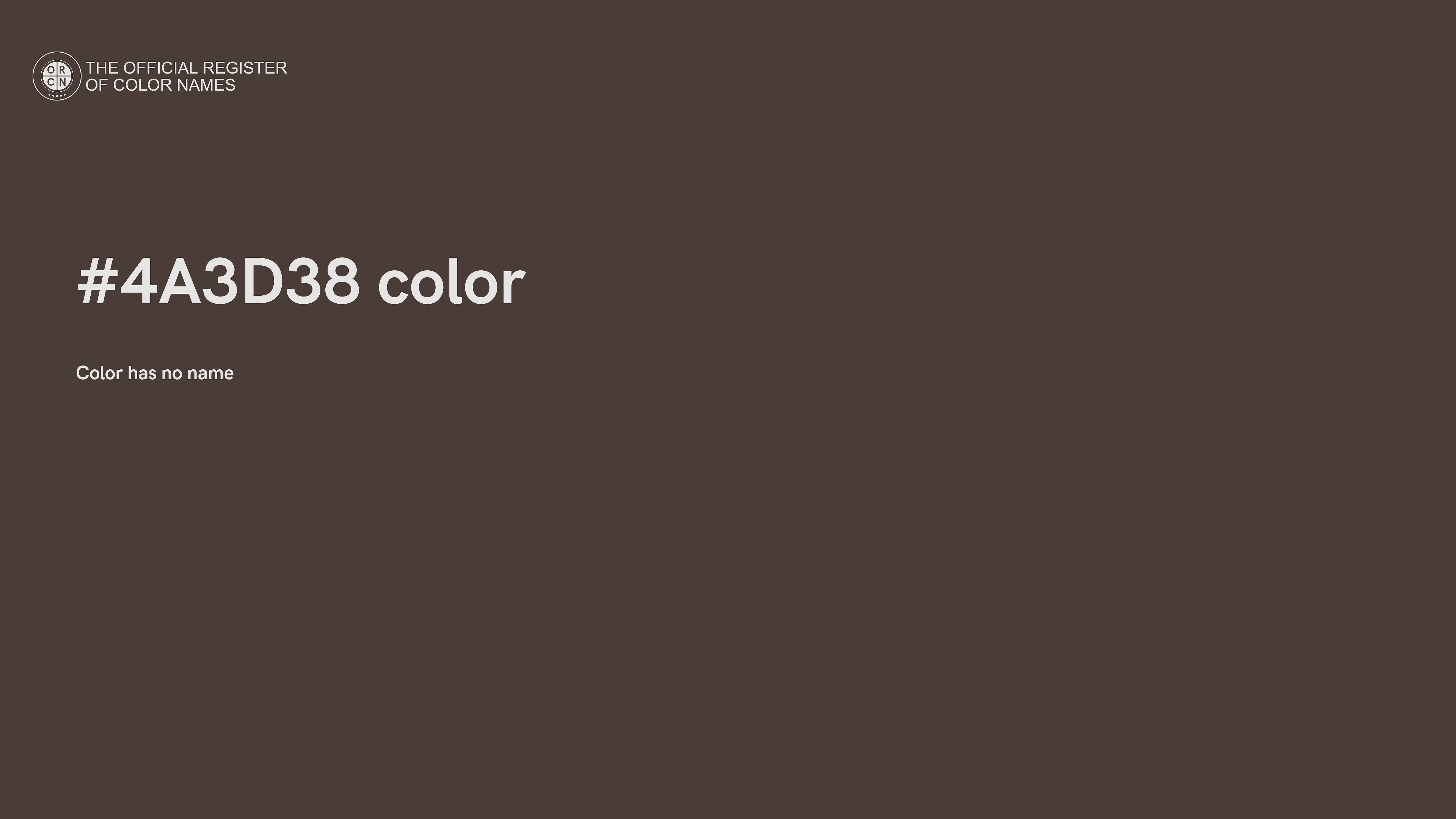 The digital color HEX #4A3D38 belongs to the Orange Color Family featuring Low Saturation (Saturation Family) and Neutral (Brightness Family).