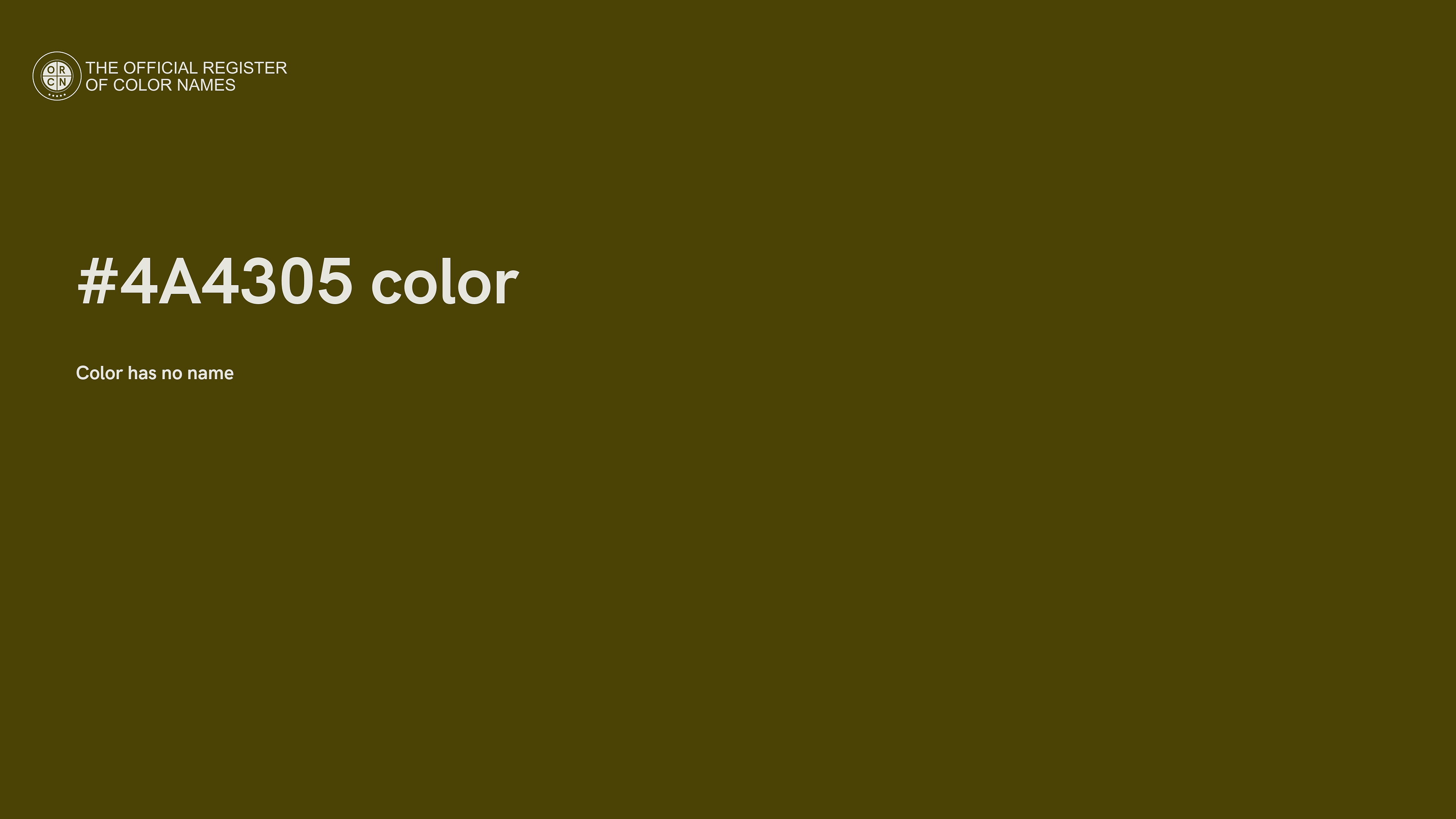 The digital color HEX #4A4305 belongs to the Yellow Color Family featuring Full Saturation (Saturation Family) and Dark (Brightness Family).