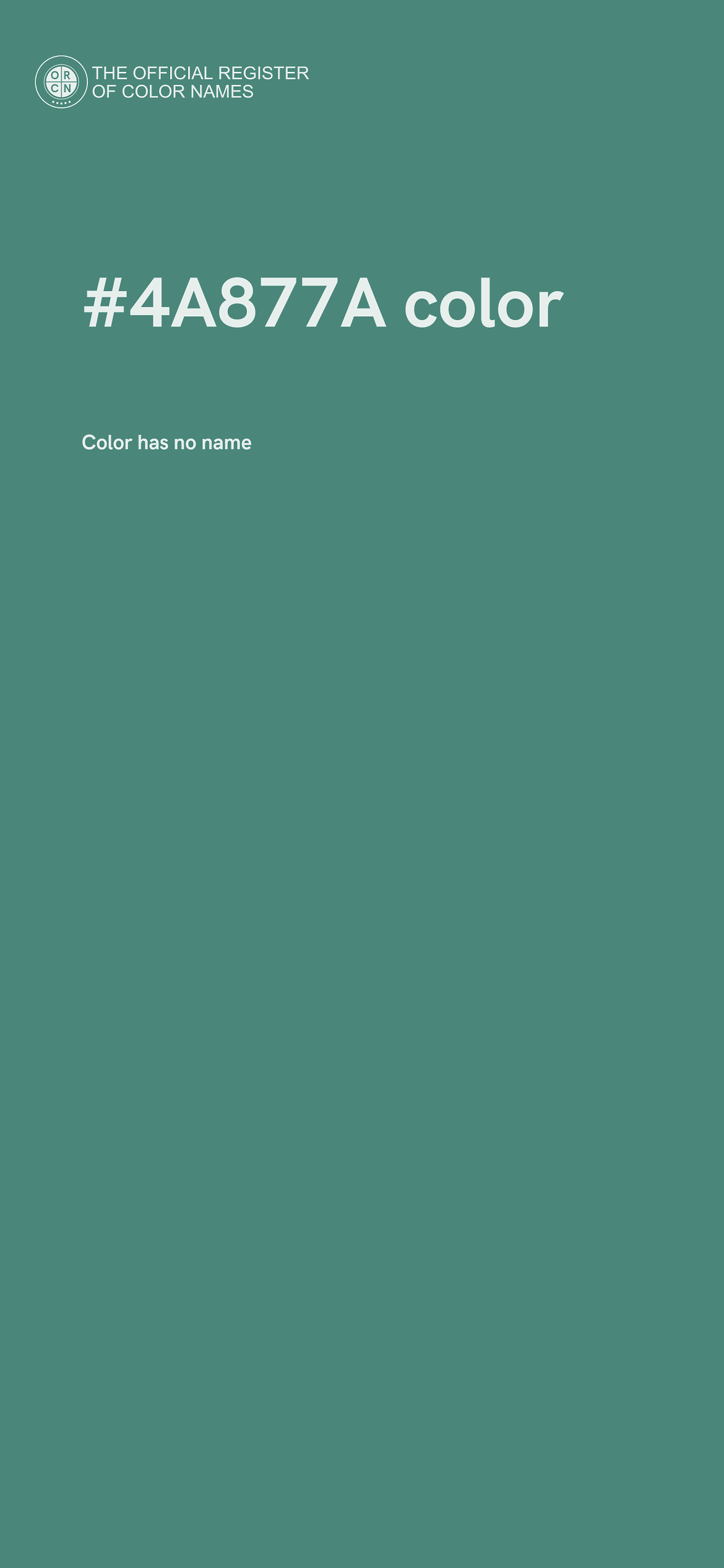 The digital color HEX #4A877A belongs to the Cyan Color Family featuring Mild Saturation (Saturation Family) and Light (Brightness Family).