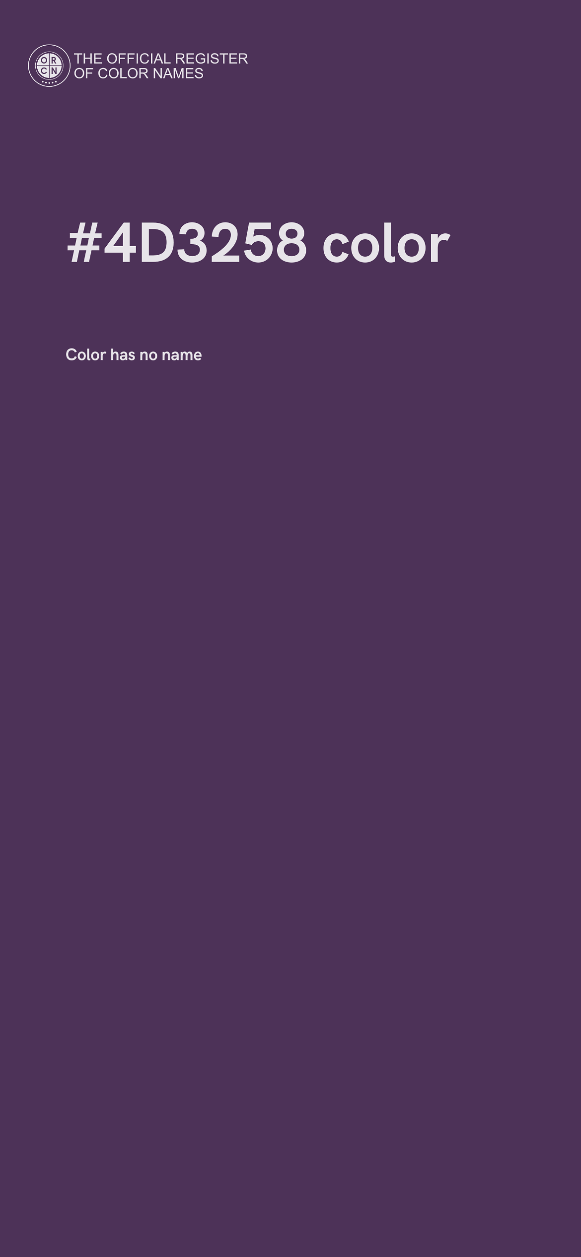 The digital color HEX #4D3258 belongs to the Violet Color Family featuring Mild Saturation (Saturation Family) and Neutral (Brightness Family).