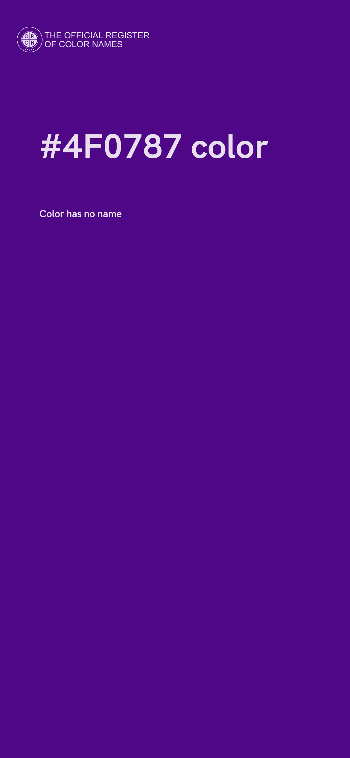 The digital color HEX #4F0787 belongs to the Violet Color Family featuring Full Saturation (Saturation Family) and Neutral (Brightness Family).