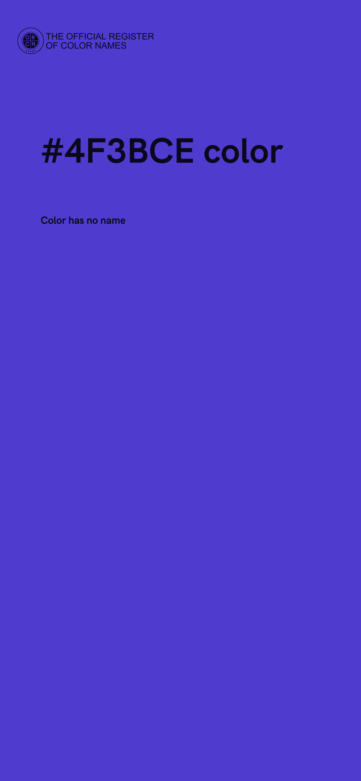 For printing in non digital world, #4F3BCE is represented in CMYK as 50 Cyan, 58 Magenta, 0 Yellow, and 19 Black (Key) (C:50 M:58 Y:0 K:19).