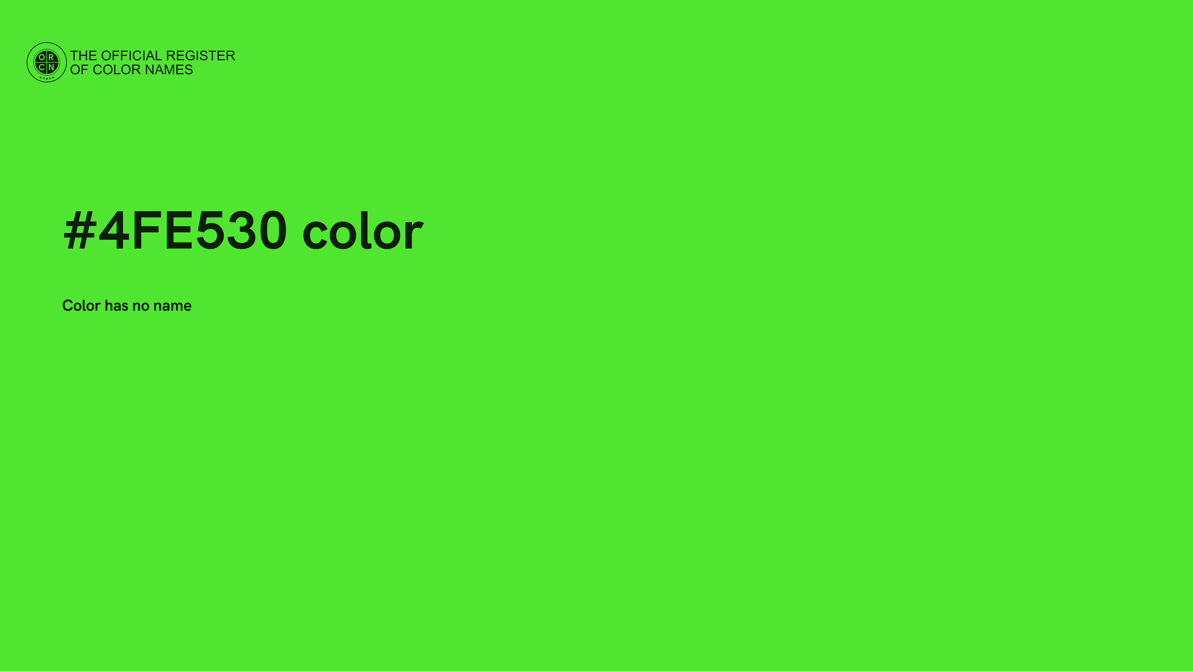 The digital color HEX #4FE530 belongs to the Green Color Family featuring High Saturation (Saturation Family) and Light (Brightness Family).