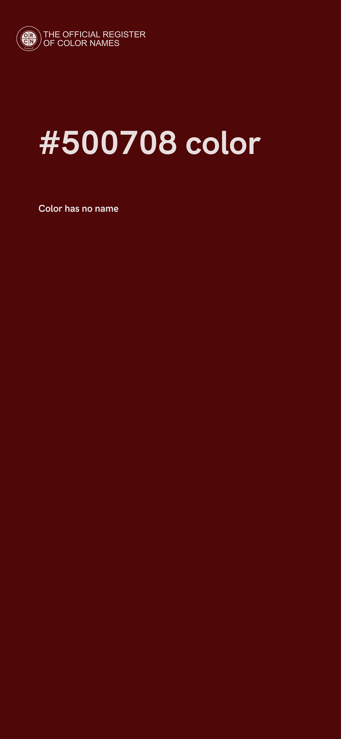 The digital color HEX #500708 belongs to the Red Color Family featuring High Saturation (Saturation Family) and Dark (Brightness Family).