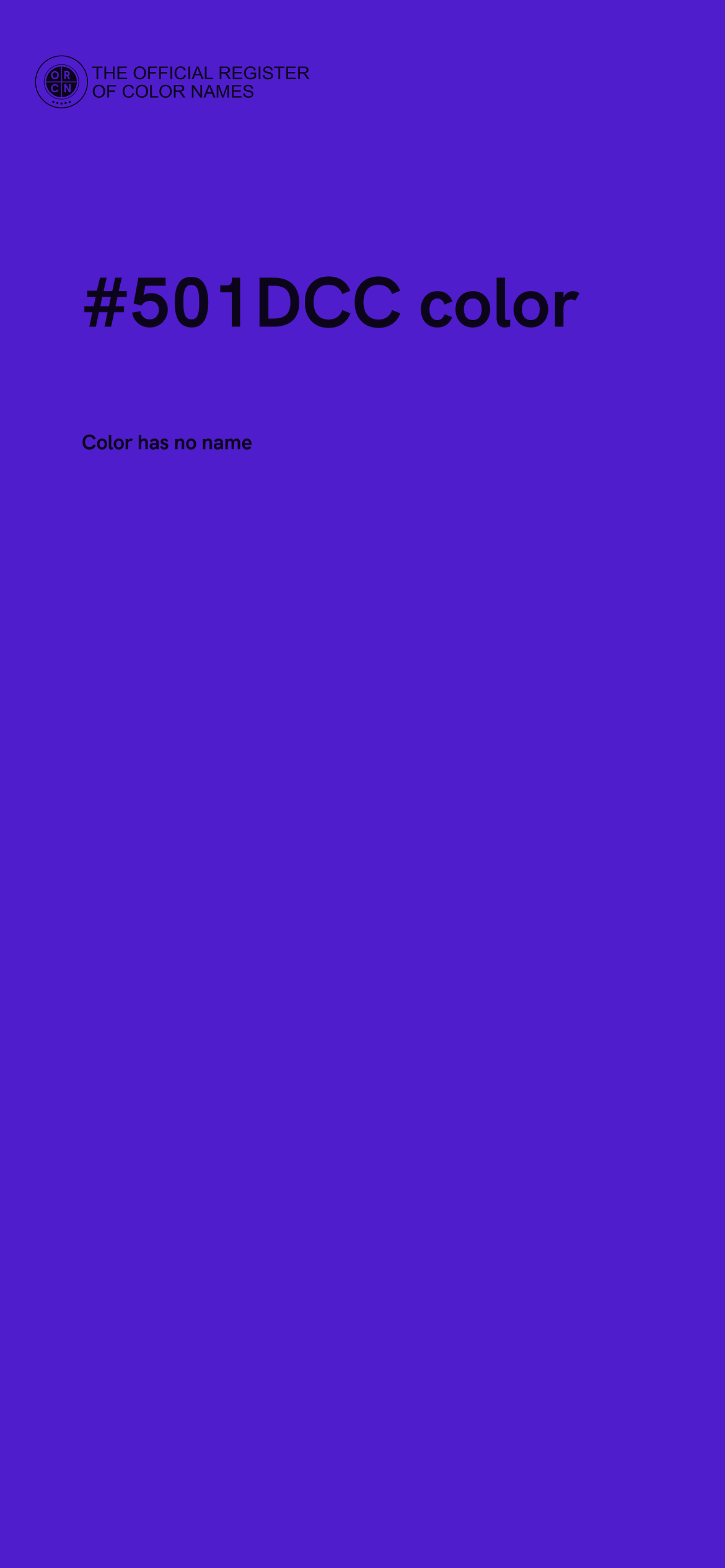 For printing in non digital world, #501DCC is represented in CMYK as 49 Cyan, 69 Magenta, 0 Yellow, and 20 Black (Key) (C:49 M:69 Y:0 K:20).
