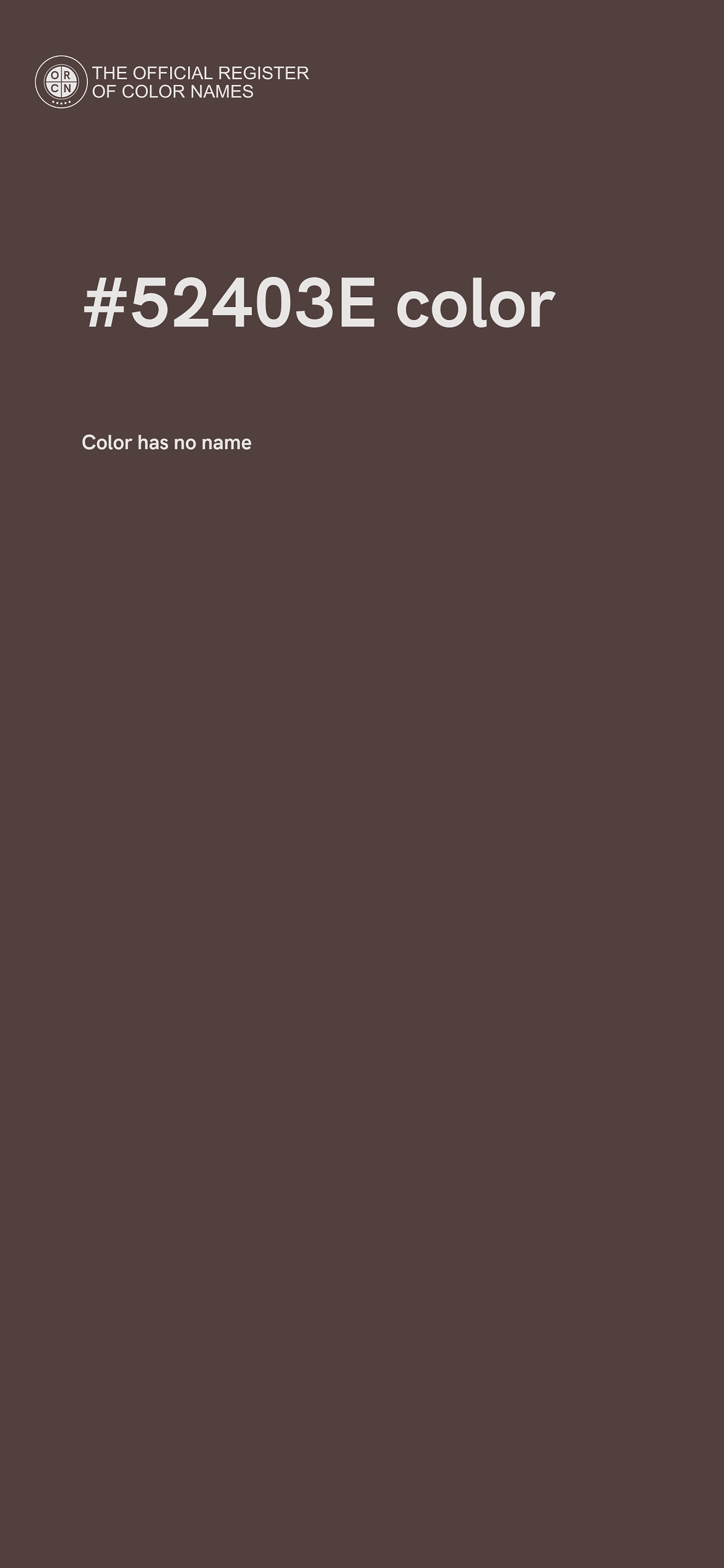 The digital color HEX #52403E belongs to the Red Color Family featuring Low Saturation (Saturation Family) and Neutral (Brightness Family).