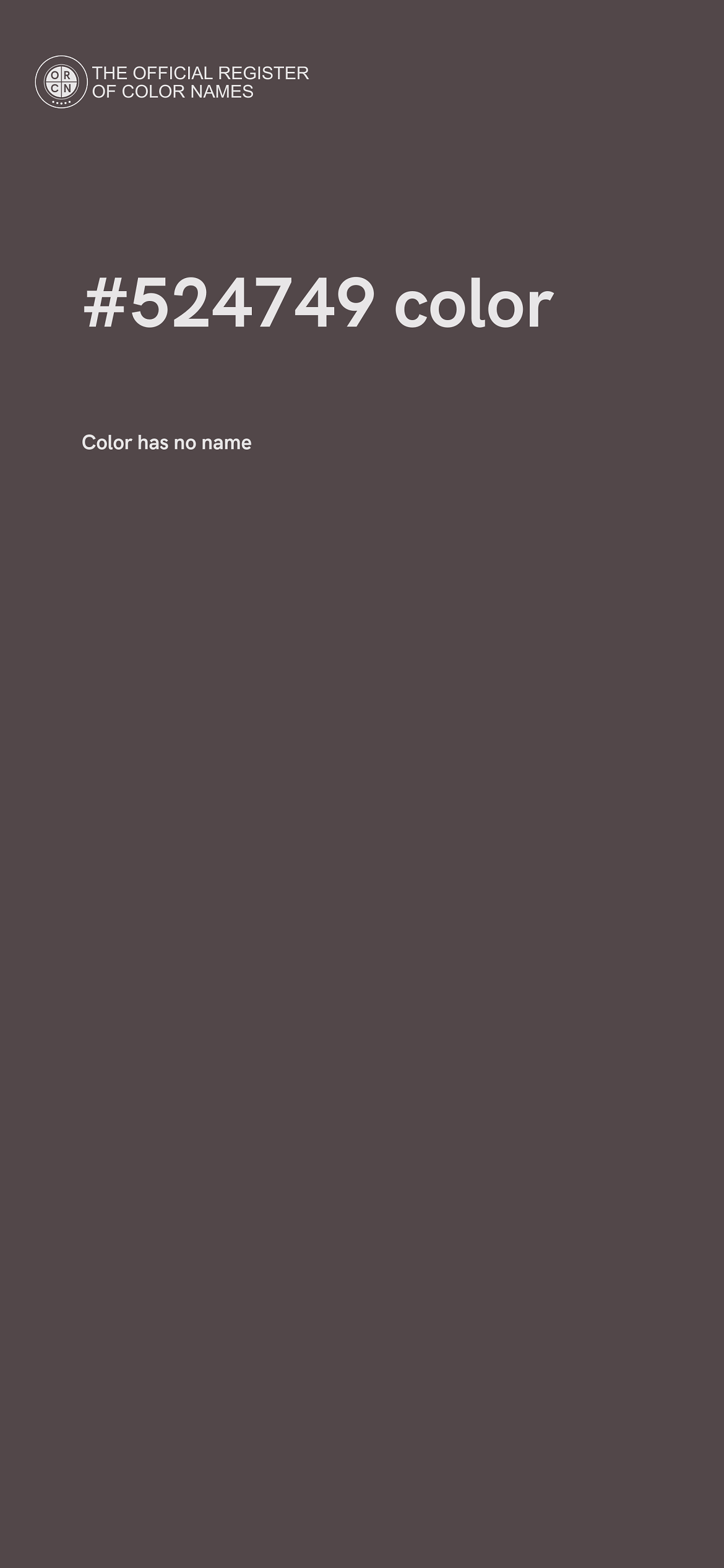 For printing in non digital world, #524749 is represented in CMYK as 0 Cyan, 4 Magenta, 4 Yellow, and 68 Black (Key) (C:0 M:4 Y:4 K:68).