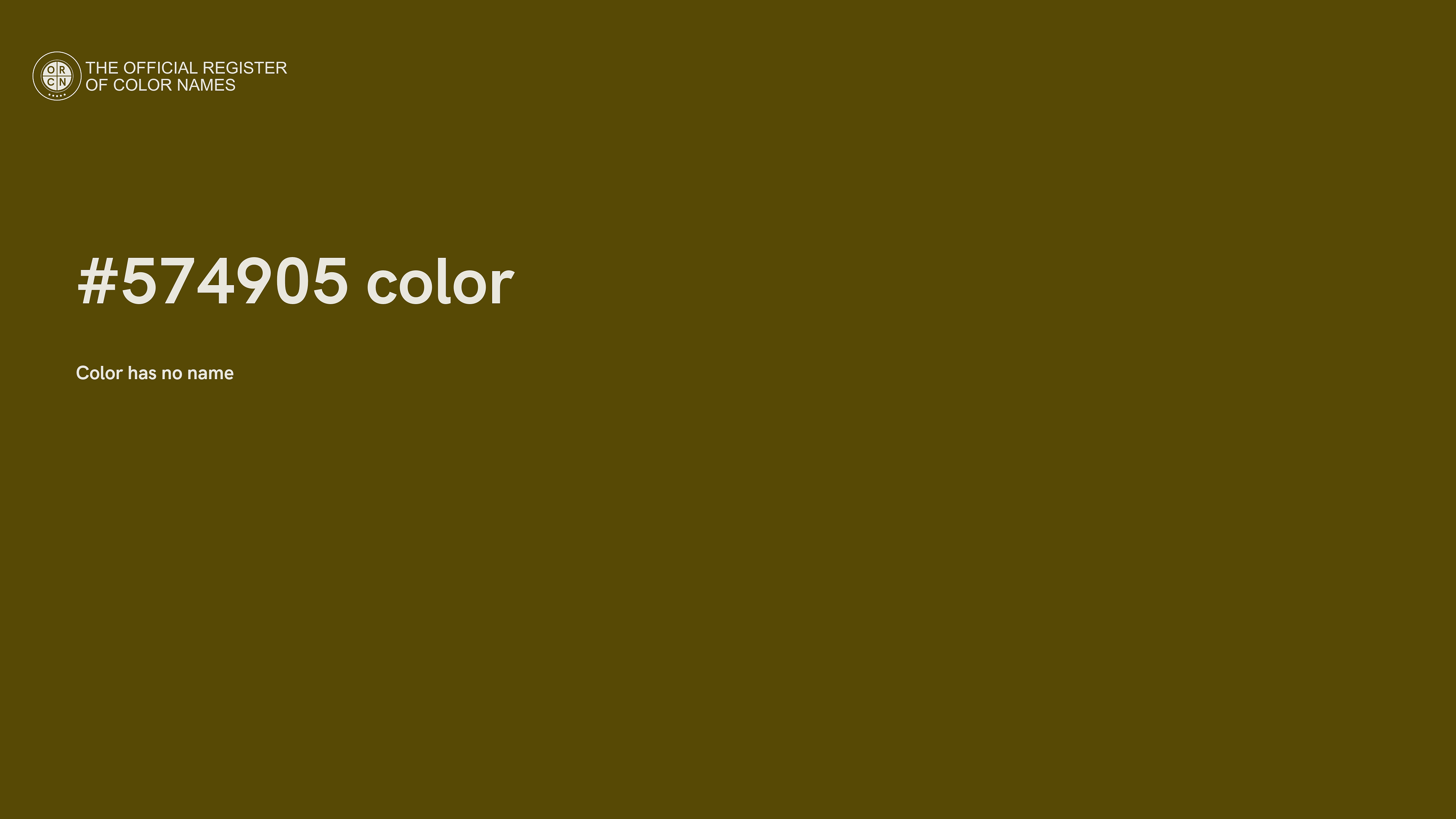 For printing in non digital world, #574905 is represented in CMYK as 0 Cyan, 5 Magenta, 32 Yellow, and 66 Black (Key) (C:0 M:5 Y:32 K:66).