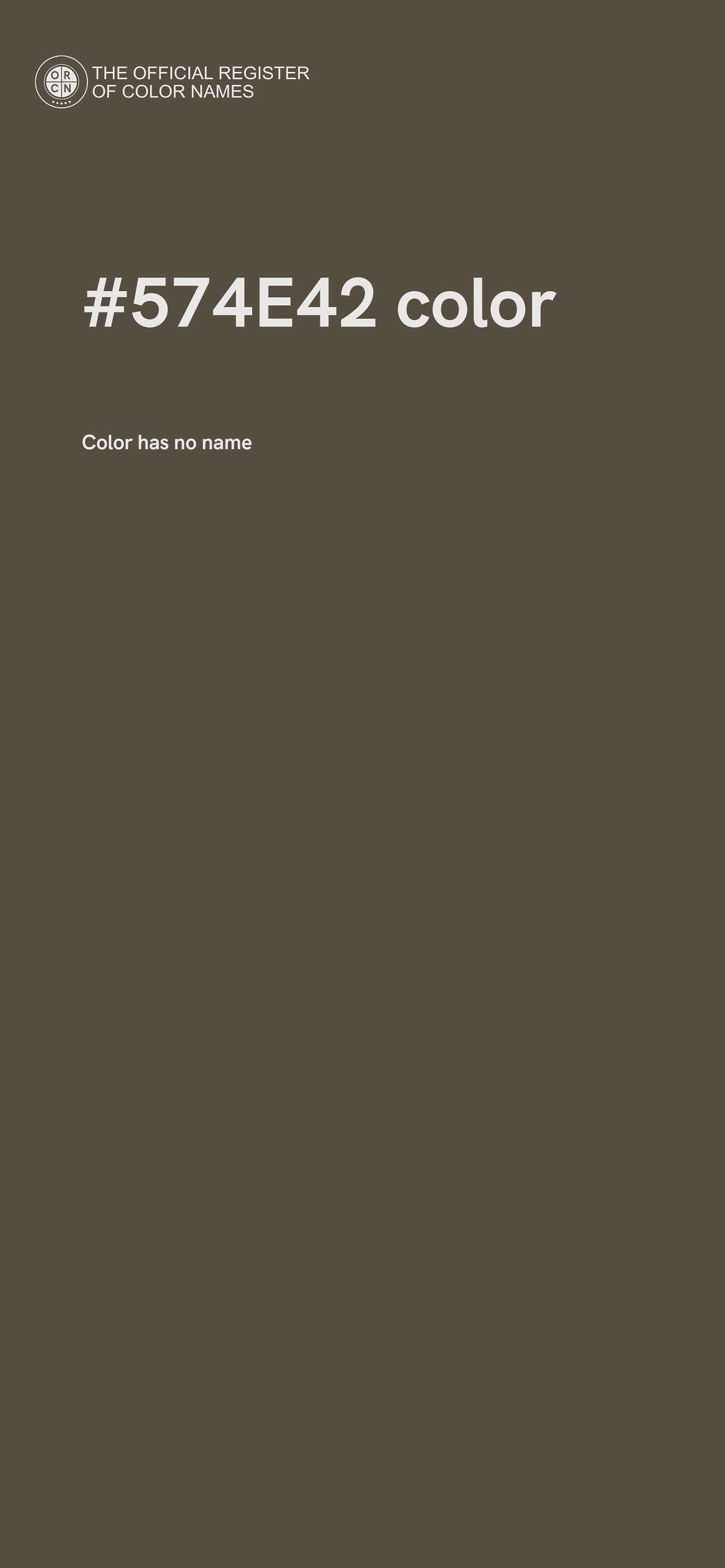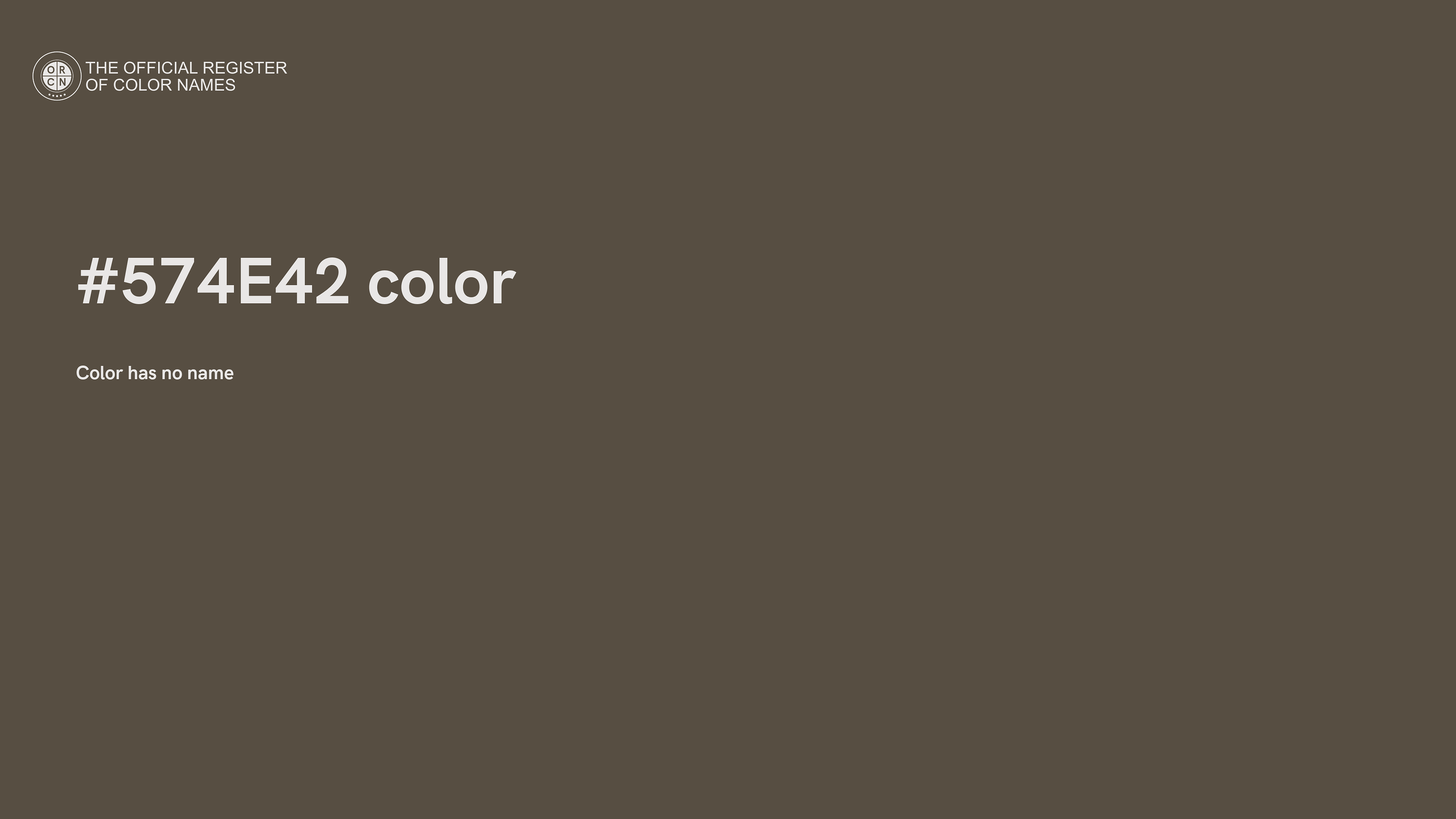For printing in non digital world, #574E42 is represented in CMYK as 0 Cyan, 4 Magenta, 8 Yellow, and 66 Black (Key) (C:0 M:4 Y:8 K:66).