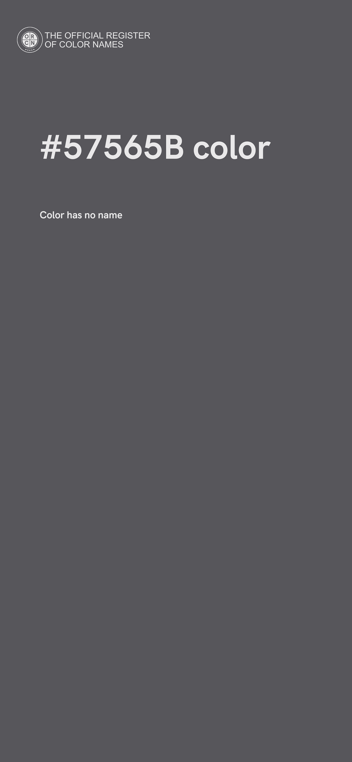 The digital color HEX #57565B belongs to the Blue Color Family featuring Desaturated (Saturation Family) and Neutral (Brightness Family).