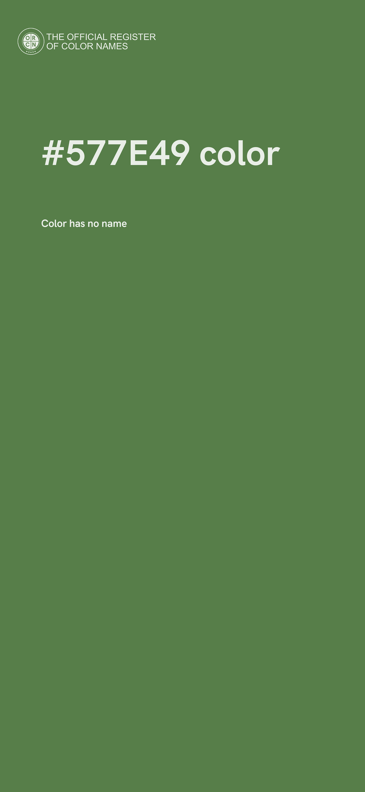 For printing in non digital world, #577E49 is represented in CMYK as 15 Cyan, 0 Magenta, 21 Yellow, and 51 Black (Key) (C:15 M:0 Y:21 K:51).