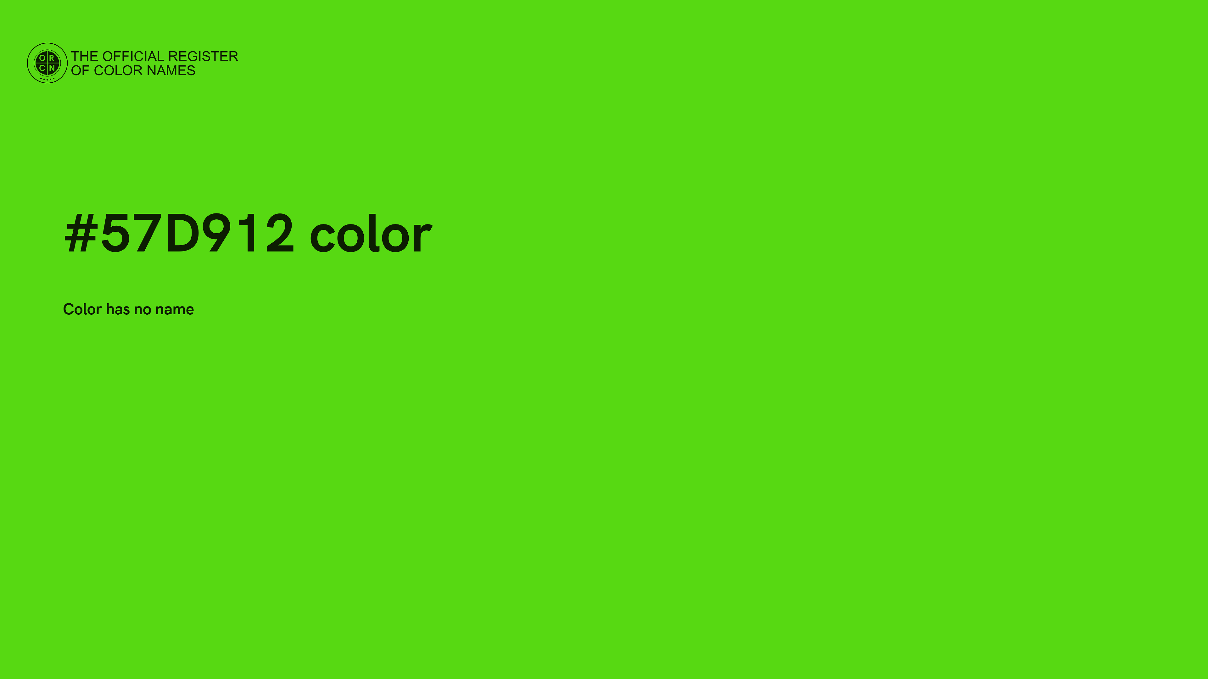 The digital color HEX #57D912 belongs to the Chartreuse Color Family featuring Full Saturation (Saturation Family) and Light (Brightness Family).