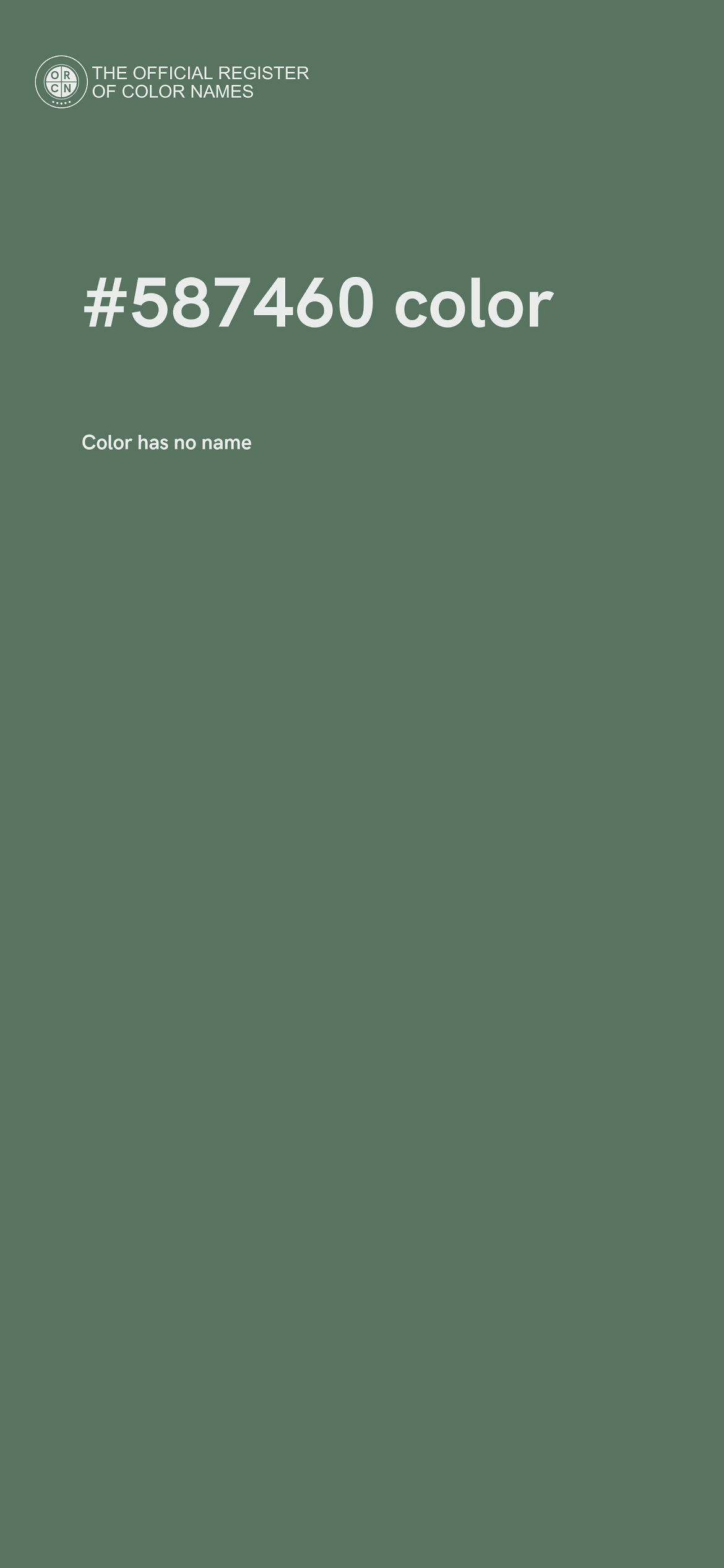 The digital color HEX #587460 belongs to the Spring Green Color Family featuring Low Saturation (Saturation Family) and Light (Brightness Family).