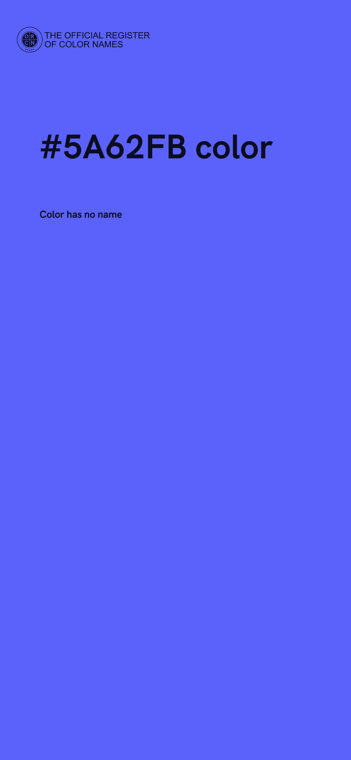 The digital color HEX #5A62FB belongs to the Blue Color Family featuring Full Saturation (Saturation Family) and Very Light (Brightness Family).