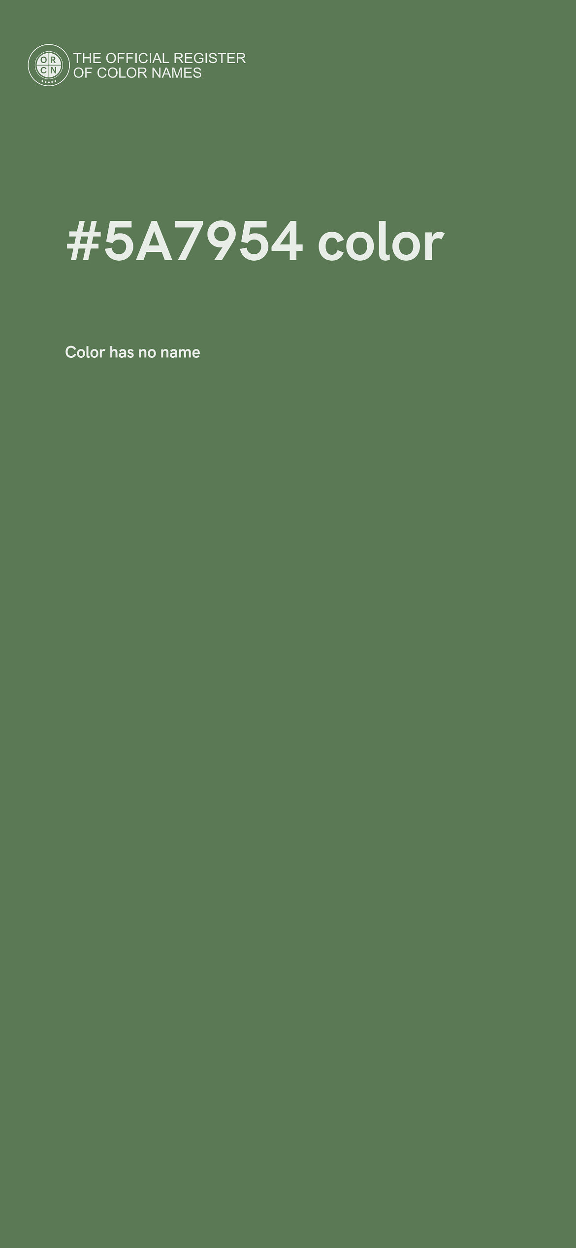 The digital color HEX #5A7954 belongs to the Green Color Family featuring Low Saturation (Saturation Family) and Light (Brightness Family).