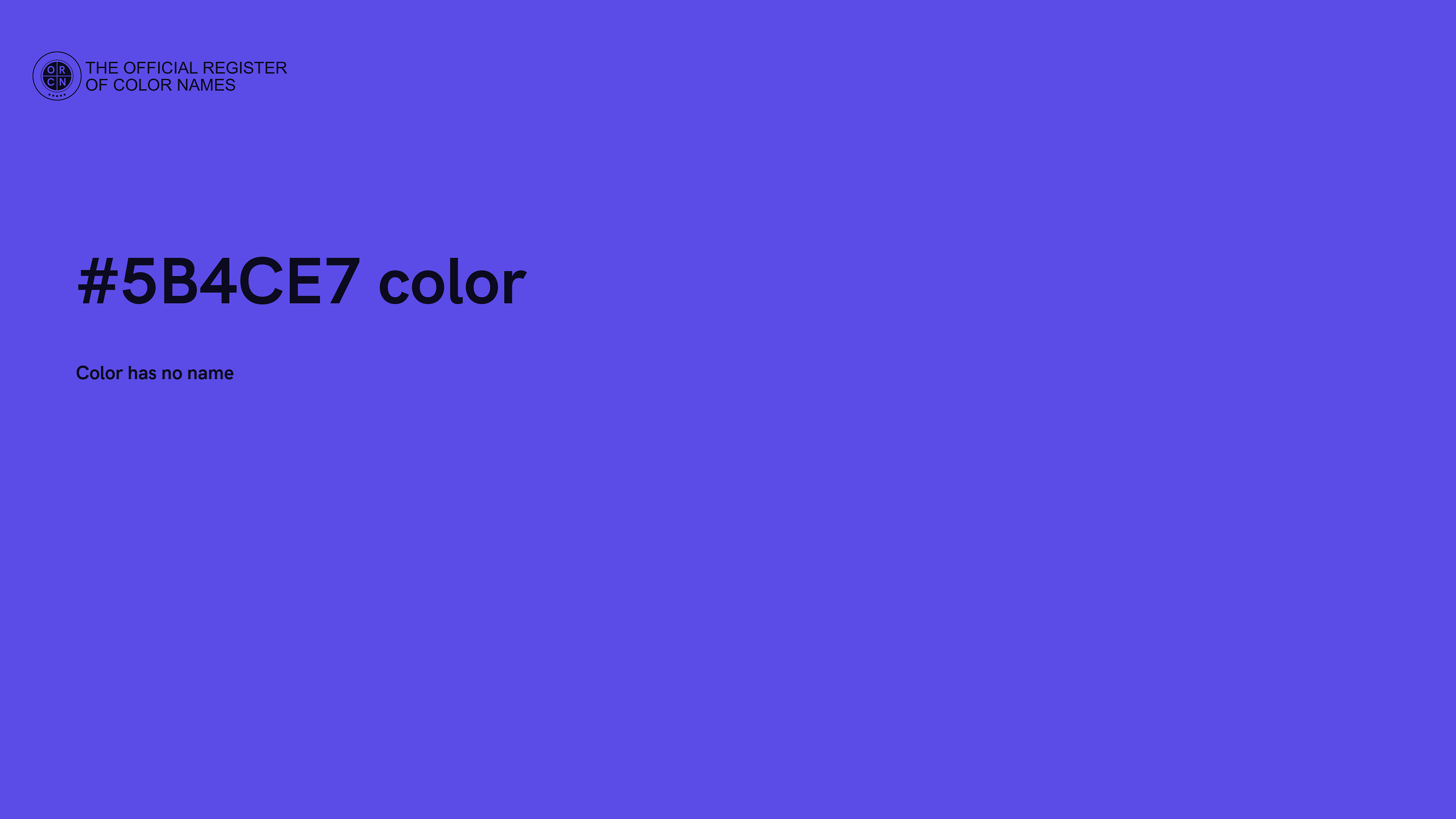 For printing in non digital world, #5B4CE7 is represented in CMYK as 55 Cyan, 61 Magenta, 0 Yellow, and 9 Black (Key) (C:55 M:61 Y:0 K:9).
