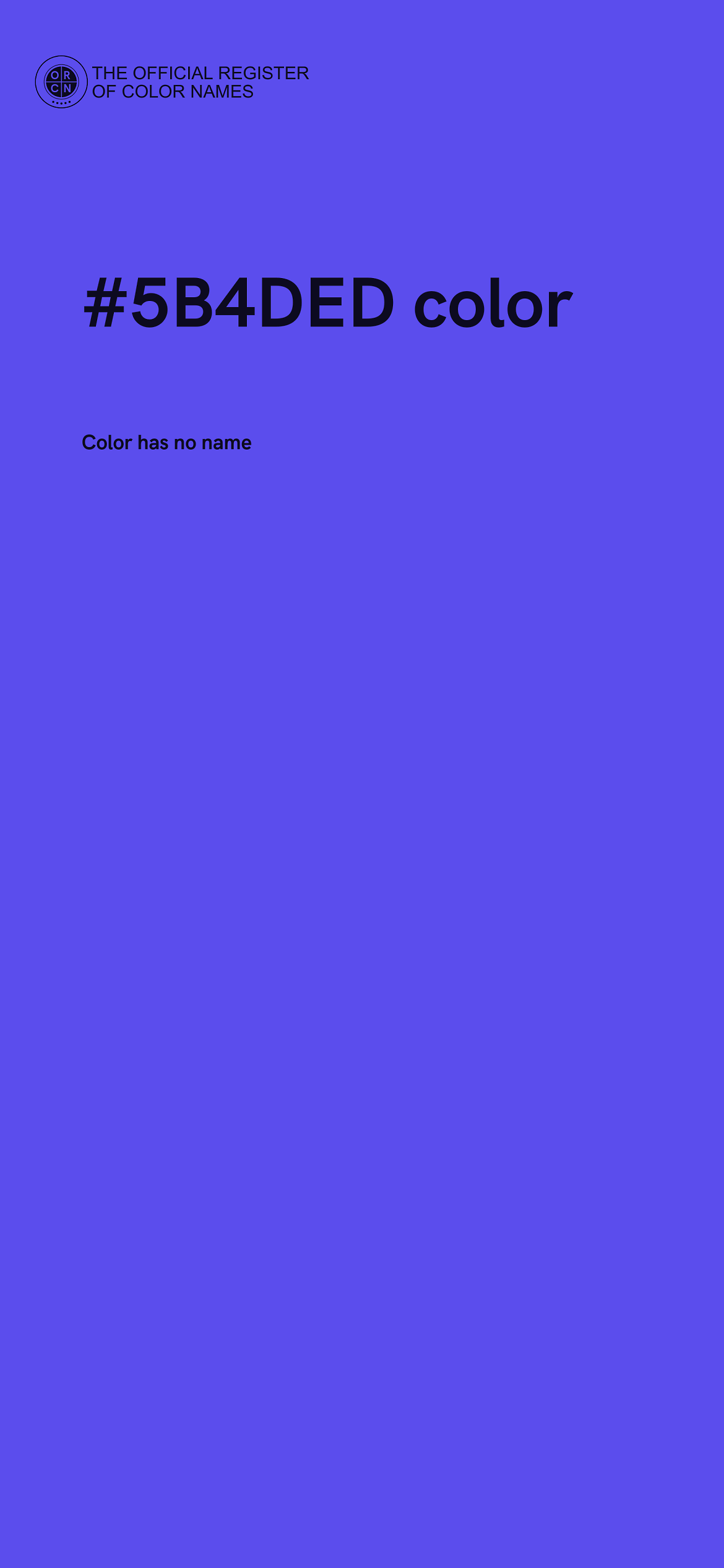 The digital color HEX #5B4DED belongs to the Blue Color Family featuring High Saturation (Saturation Family) and Very Light (Brightness Family).