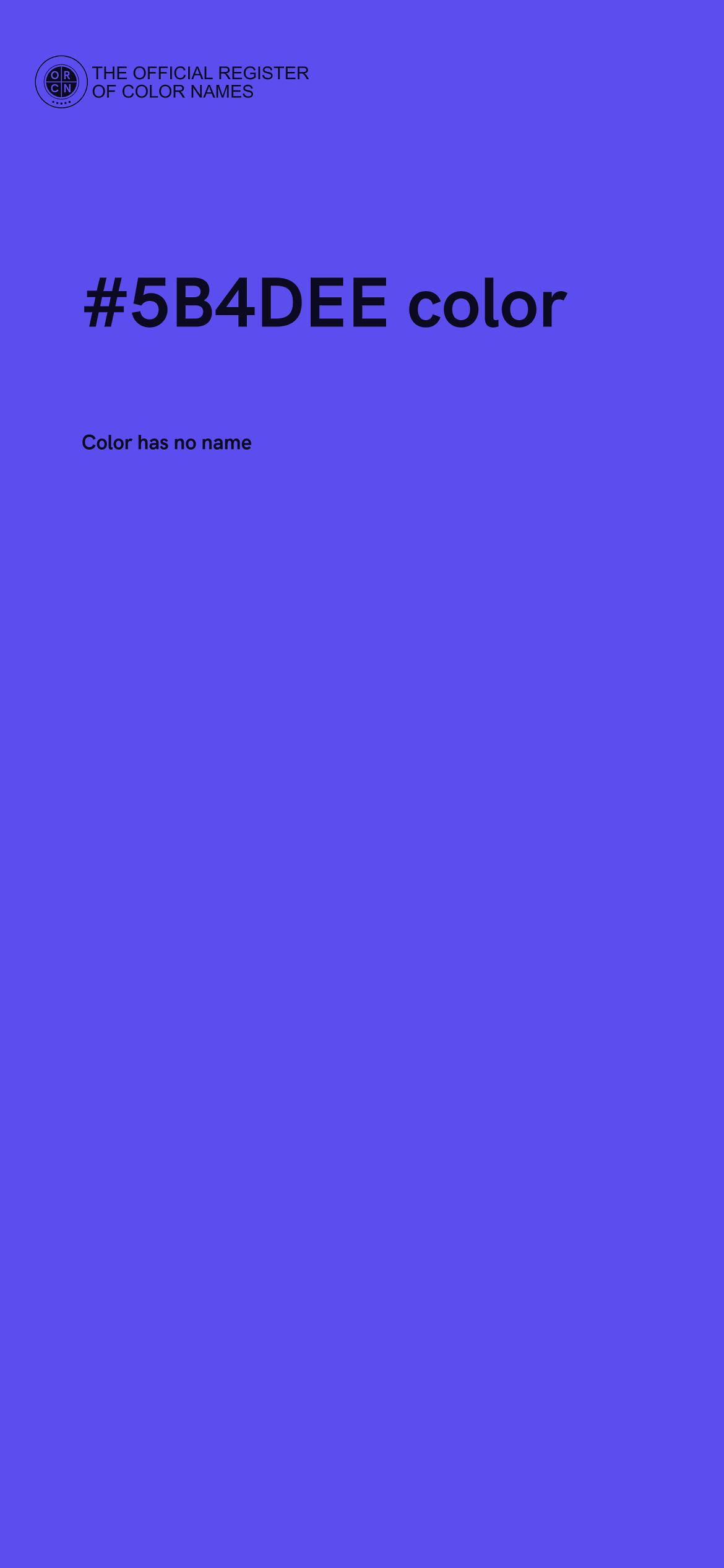 For printing in non digital world, #5B4DEE is represented in CMYK as 58 Cyan, 63 Magenta, 0 Yellow, and 7 Black (Key) (C:58 M:63 Y:0 K:7).