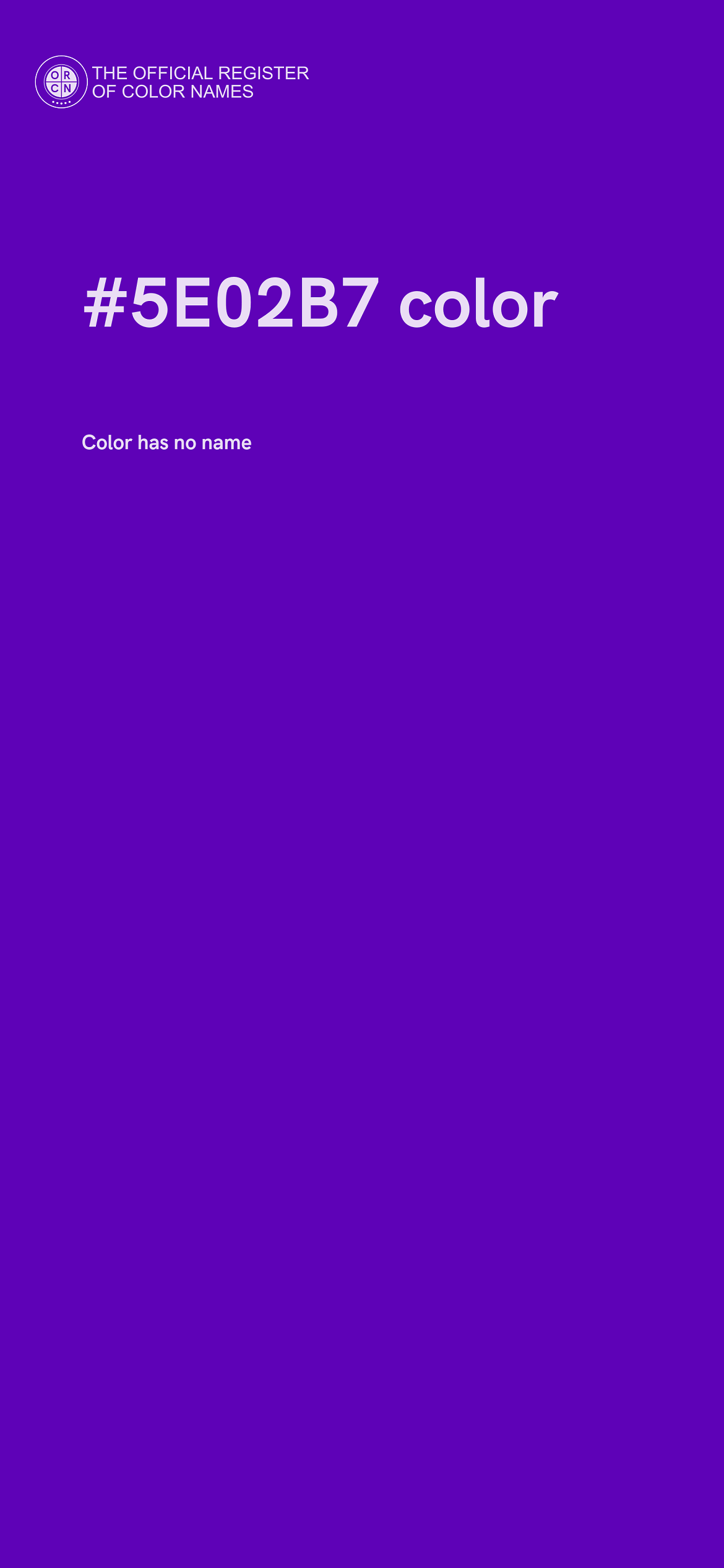 The digital color HEX #5E02B7 belongs to the Violet Color Family featuring Full Saturation (Saturation Family) and Neutral (Brightness Family).