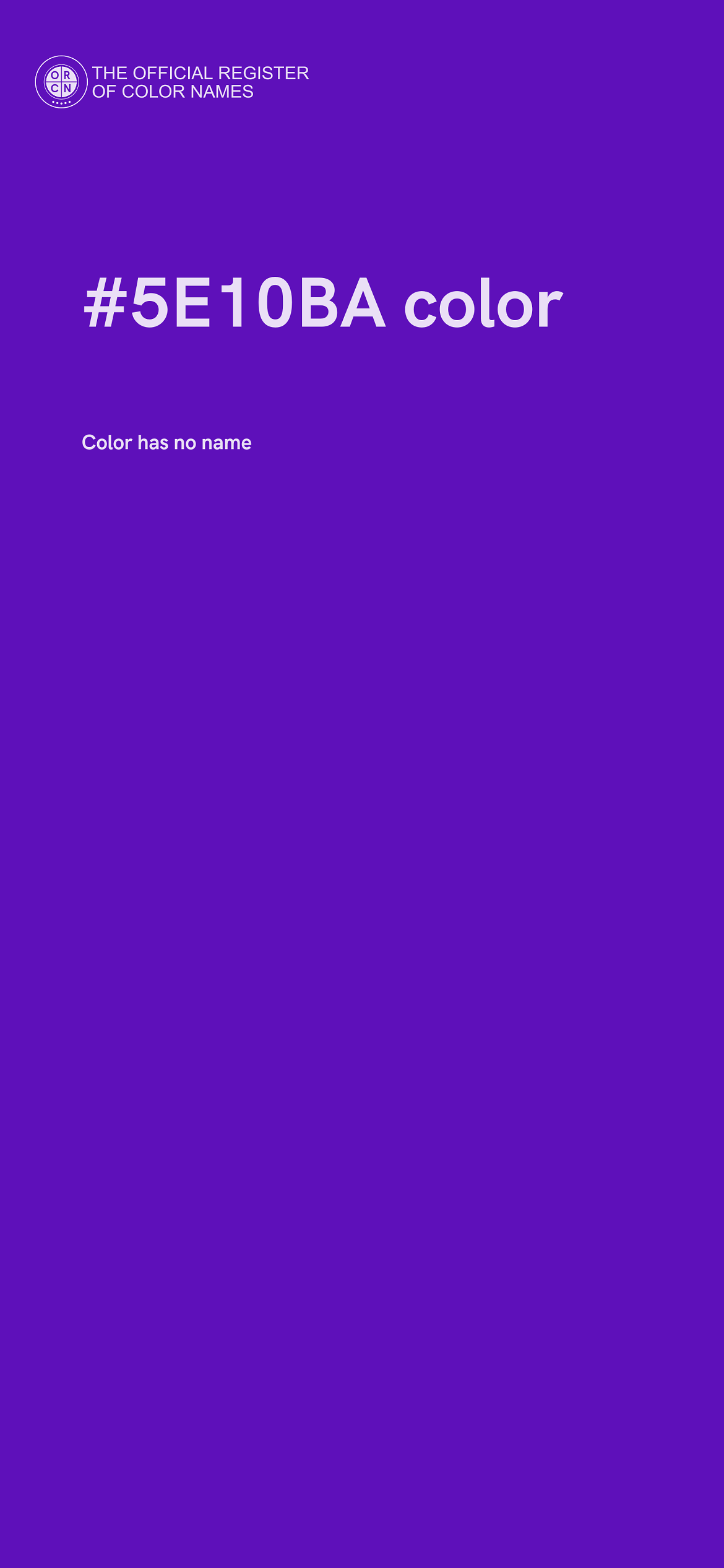 For printing in non digital world, #5E10BA is represented in CMYK as 36 Cyan, 67 Magenta, 0 Yellow, and 27 Black (Key) (C:36 M:67 Y:0 K:27).