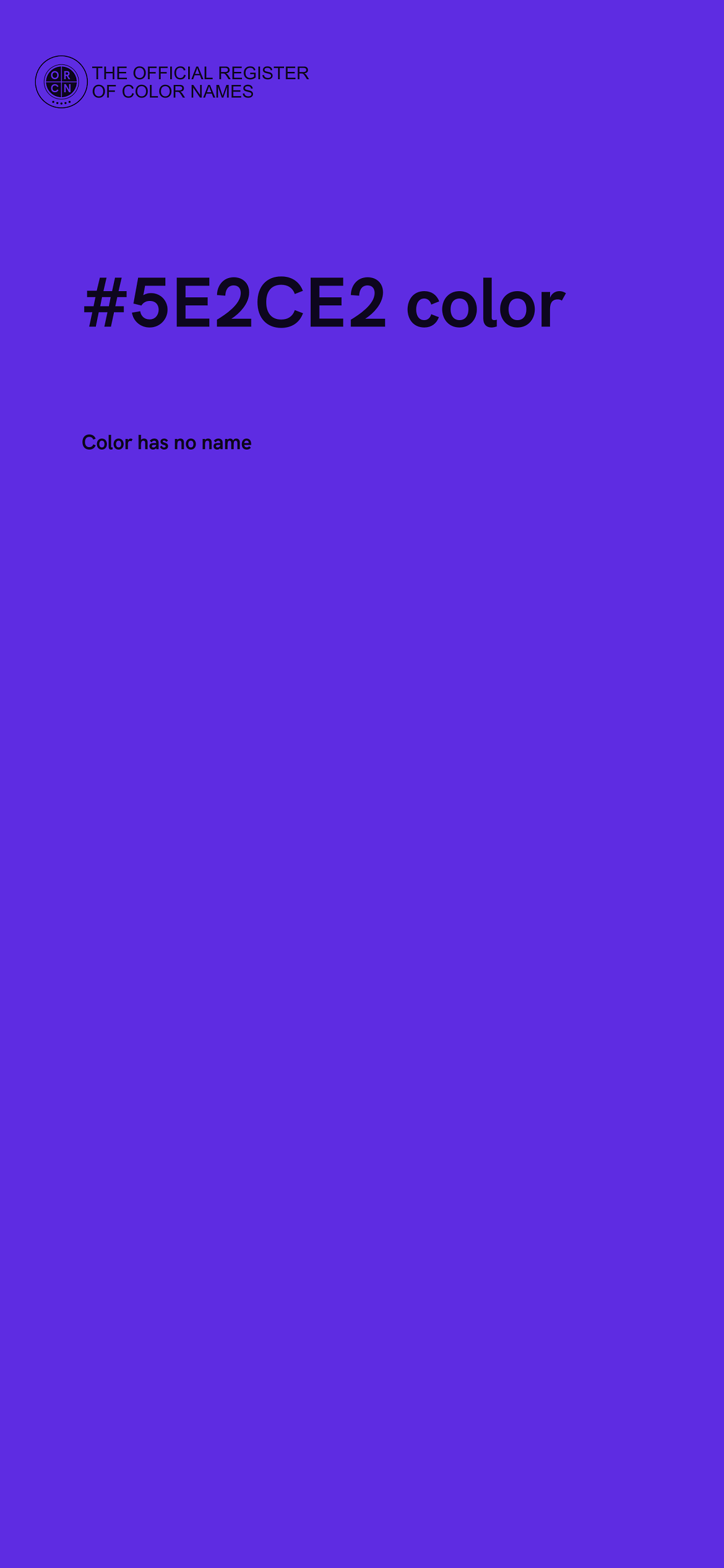 HEX code #5E2CE2 represent the color in hexadecimal format by combining three values – the amounts of Red, Green and Blue (RGB). Its RGB composition is 94, 44, 226 ( rgb(94, 44, 226) ), which breaks down into 36.9% of Red, 17.3% Green and 88.6% Blue.