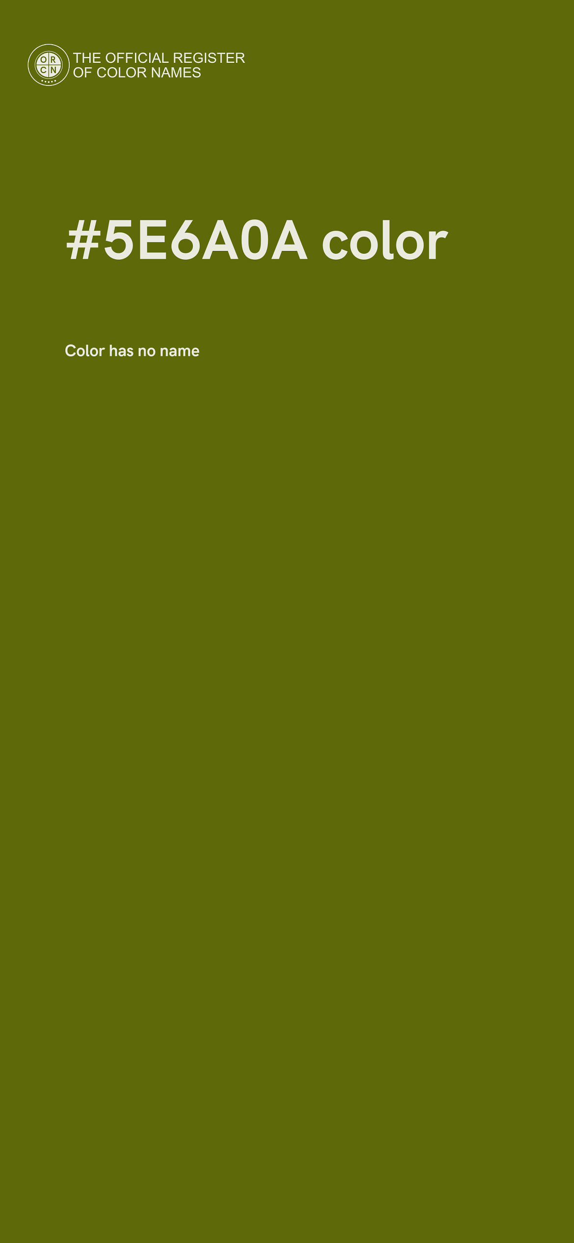 The digital color HEX #5E6A0A belongs to the Yellow Color Family featuring High Saturation (Saturation Family) and Dark (Brightness Family).