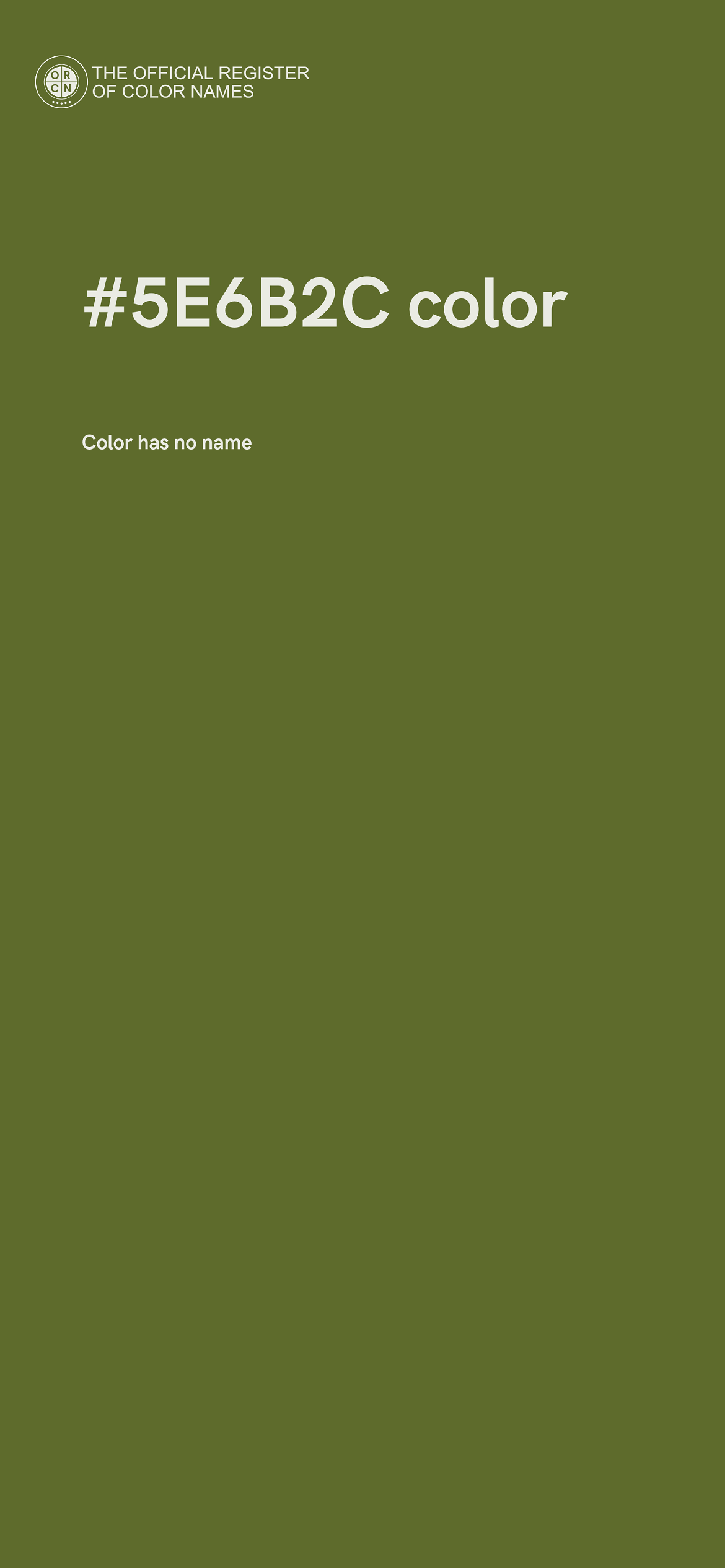 The digital color HEX #5E6B2C belongs to the Yellow Color Family featuring Moderate Saturation (Saturation Family) and Neutral (Brightness Family).