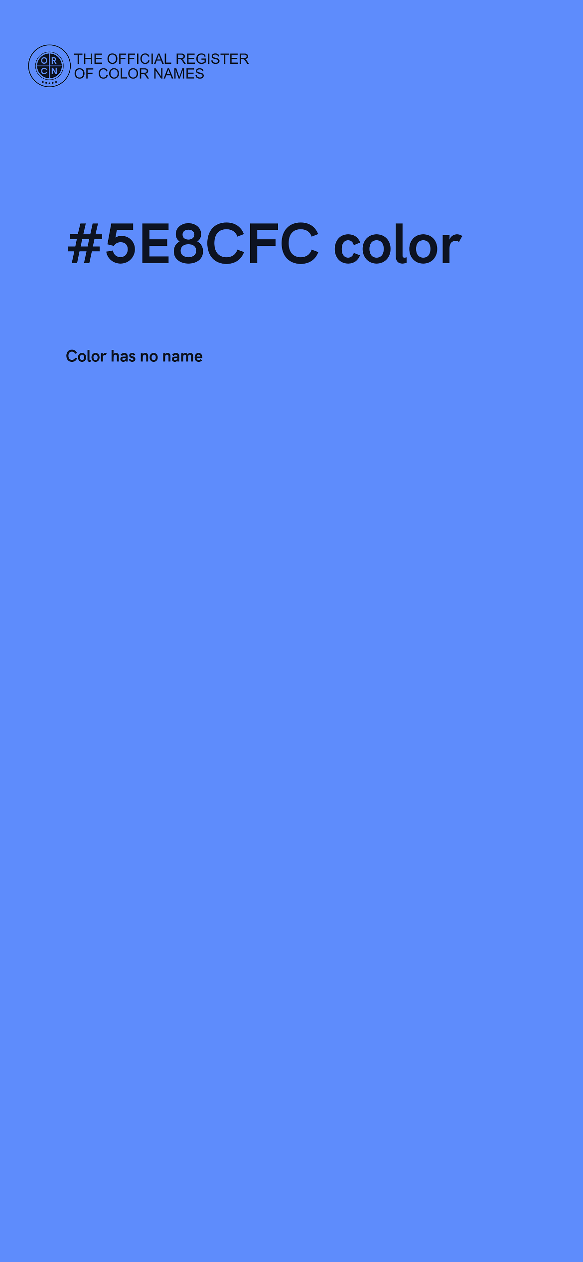 The digital color HEX #5E8CFC belongs to the Azure Color Family featuring Full Saturation (Saturation Family) and Very Light (Brightness Family).