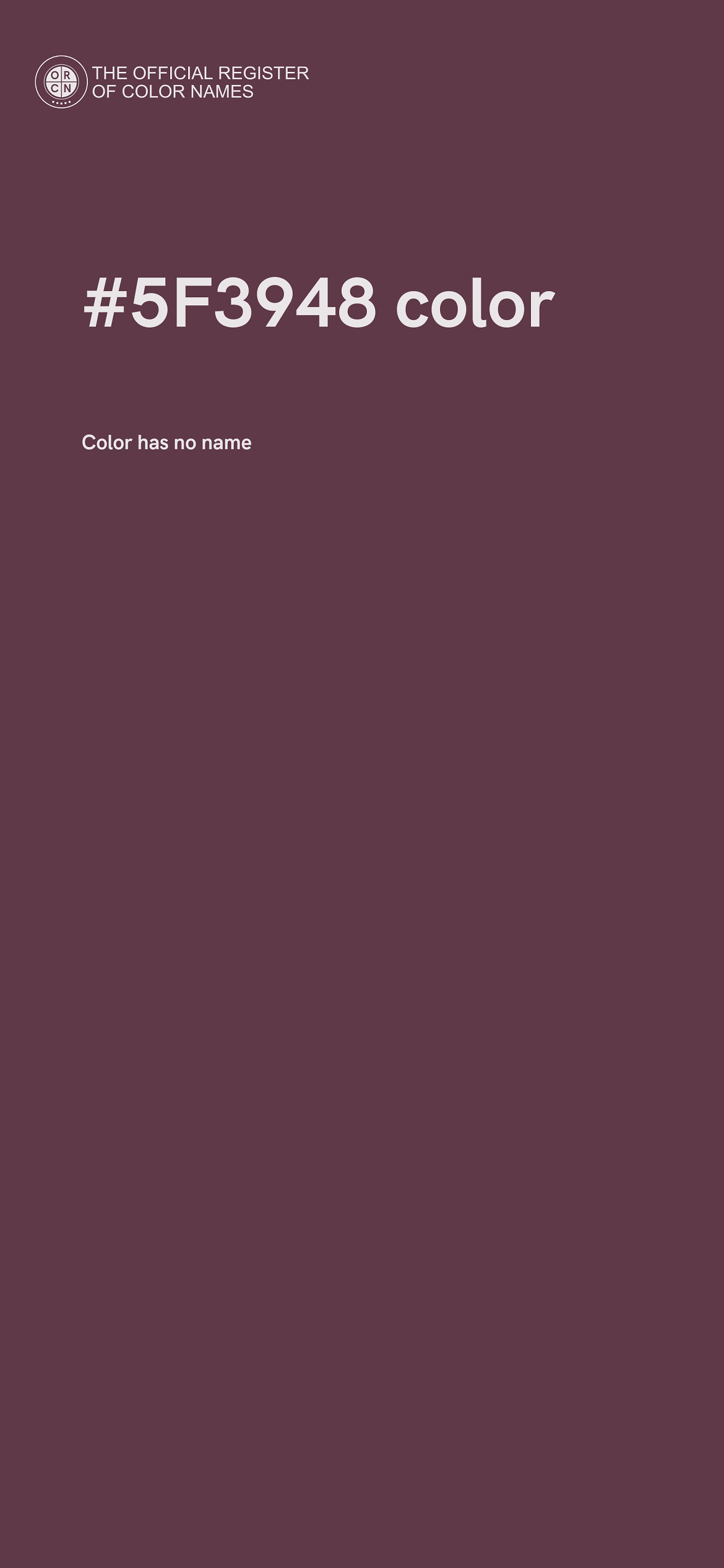 The digital color HEX #5F3948 belongs to the Rose Color Family featuring Mild Saturation (Saturation Family) and Neutral (Brightness Family).