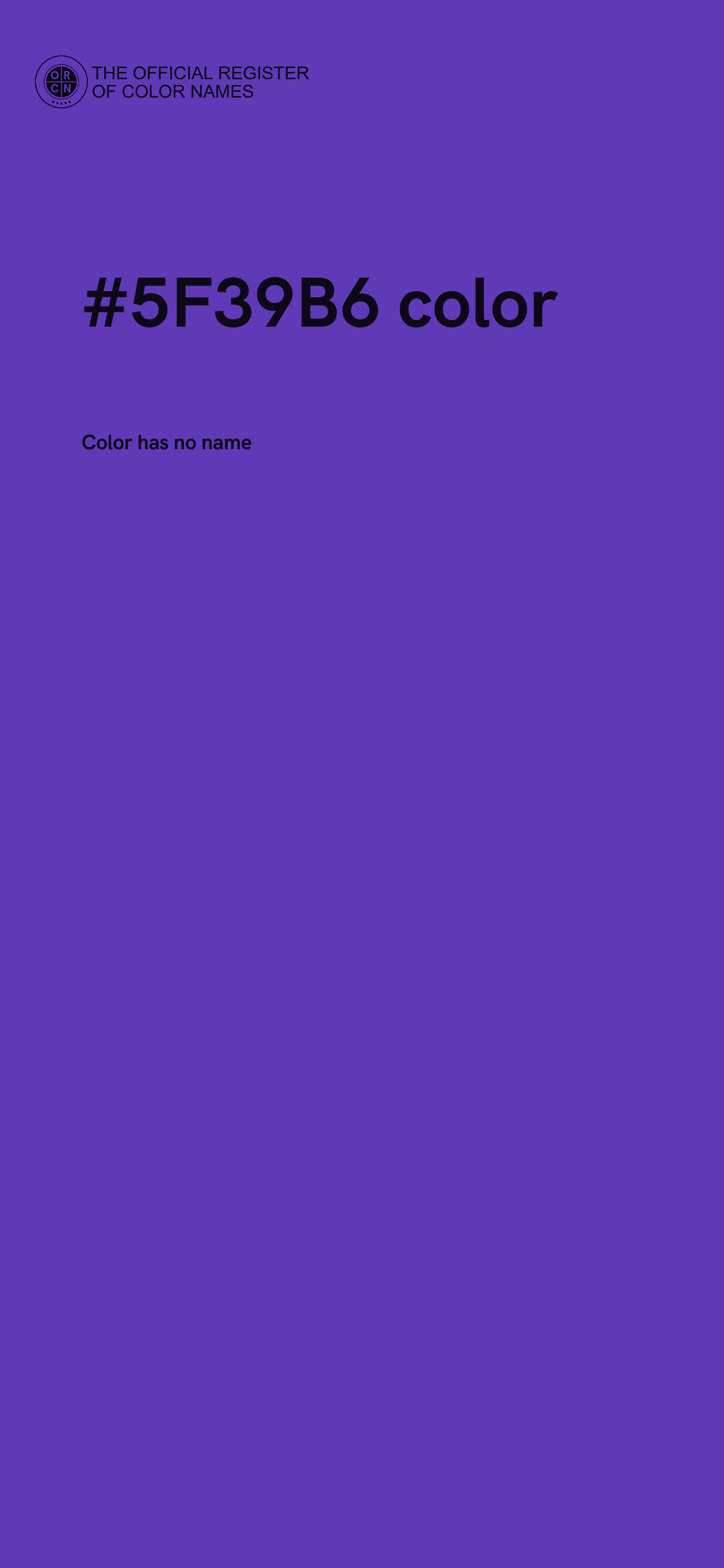 For printing in non digital world, #5F39B6 is represented in CMYK as 34 Cyan, 49 Magenta, 0 Yellow, and 29 Black (Key) (C:34 M:49 Y:0 K:29).